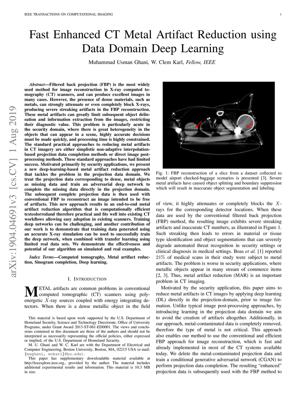 Filtered back projection (FBP) is the most widely used method for image reconstruction in X-ray computed tomography (CT) scanners. The presence of hyper-dense materials in a scene, such as metals, can strongly attenuate X-rays, producing severe streaking artifacts in the reconstruction. These metal artifacts can greatly limit subsequent object delineation and information extraction from the images, restricting their diagnostic value. This problem is particularly acute in the security domain, where there is great heterogeneity in the objects that can appear in a scene, highly accurate decisions must be made quickly. The standard practical approaches to reducing metal artifacts in CT imagery are either simplistic non-adaptive interpolation-based projection data completion methods or direct image post-processing methods. These standard approaches have had limited success. Motivated primarily by security applications, we present a new deep-learning-based metal artifact reduction (MAR) approach that tackles the problem in the projection data domain. We treat the projection data corresponding to metal objects as missing data and train an adversarial deep network to complete the missing data in the projection domain. The subsequent complete projection data is then used with FBP to reconstruct image intended to be free of artifacts. This new approach results in an end-to-end MAR algorithm that is computationally efficient so practical and fits well into existing CT workflows allowing easy adoption in existing scanners. Training deep networks can be challenging, and another contribution of our work is to demonstrate that training data generated using an accurate X-ray simulation can be used to successfully train the deep network when combined with transfer learning using limited real data sets. We demonstrate the effectiveness and potential of our algorithm on simulated and real examples.