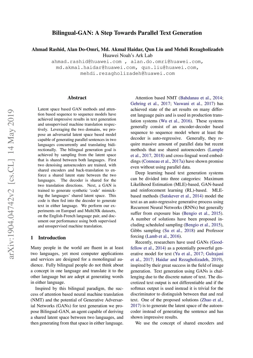 Latent space based GAN methods and attention based sequence to sequence models have achieved impressive results in text generation and unsupervised machine translation respectively. Leveraging the two domains, we propose an adversarial latent space based model capable of generating parallel sentences in two languages concurrently and translating bidirectionally. The bilingual generation goal is achieved by sampling from the latent space that is shared between both languages. First two denoising autoencoders are trained, with shared encoders and back-translation to enforce a shared latent state between the two languages. The decoder is shared for the two translation directions. Next, a GAN is trained to generate synthetic "code" mimicking the languages' shared latent space. This code is then fed into the decoder to generate text in either language. We perform our experiments on Europarl and Multi30k datasets, on the English-French language pair, and document our performance using both supervised and unsupervised machine translation.