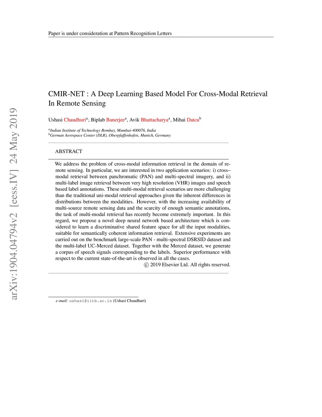 We address the problem of cross-modal information retrieval in the domain of remote sensing. In particular, we are interested in two application scenarios: i) cross-modal retrieval between panchromatic (PAN) and multi-spectral imagery, and ii) multi-label image retrieval between very high resolution (VHR) images and speech based label annotations. Notice that these multi-modal retrieval scenarios are more challenging than the traditional uni-modal retrieval approaches given the inherent differences in distributions between the modalities. However, with the growing availability of multi-source remote sensing data and the scarcity of enough semantic annotations, the task of multi-modal retrieval has recently become extremely important. In this regard, we propose a novel deep neural network based architecture which is considered to learn a discriminative shared feature space for all the input modalities, suitable for semantically coherent information retrieval. Extensive experiments are carried out on the benchmark large-scale PAN - multi-spectral DSRSID dataset and the multi-label UC-Merced dataset. Together with the Merced dataset, we generate a corpus of speech signals corresponding to the labels. Superior performance with respect to the current state-of-the-art is observed in all the cases.