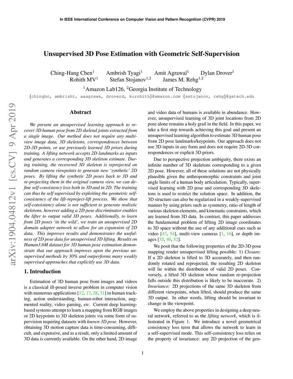 Unsupervised 3D Pose Estimation with Geometric Self-Supervision