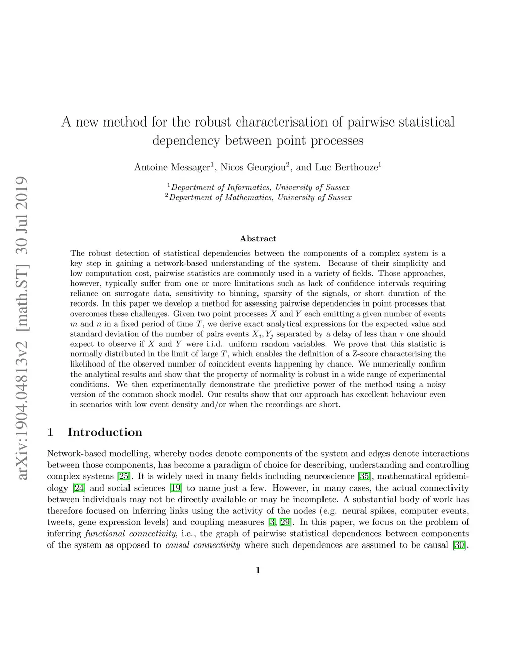The robust detection of statistical dependencies between the components of a complex system is a key step in gaining a network-based understanding of the system. Because of their simplicity and low computation cost, pairwise statistics are commonly used in a variety of fields. Those approaches, however, typically suffer from one or more limitations such as lack of confidence intervals requiring reliance on surrogate data, sensitivity to binning, sparsity of the signals, or short duration of the records. In this paper we develop a method for assessing pairwise dependencies in point processes that overcomes these challenges. Given two point processes and each emitting a given number of events and in a fixed period of time , we derive exact analytical expressions for the expected value and standard deviation of the number of pairs events separated by a delay of less than one should expect to observe if and were i.i.d. uniform random variables. We prove that this statistic is normally distributed in the limit of large , which enables the definition of a Z-score characterising the likelihood of the observed number of coincident events happening by chance. We numerically confirm the analytical results and show that the property of normality is robust in a wide range of experimental conditions. We then experimentally demonstrate the predictive power of the method using a noisy version of the common shock model. Our results show that our approach has excellent behaviour even in scenarios with low event density and/or when the recordings are short.