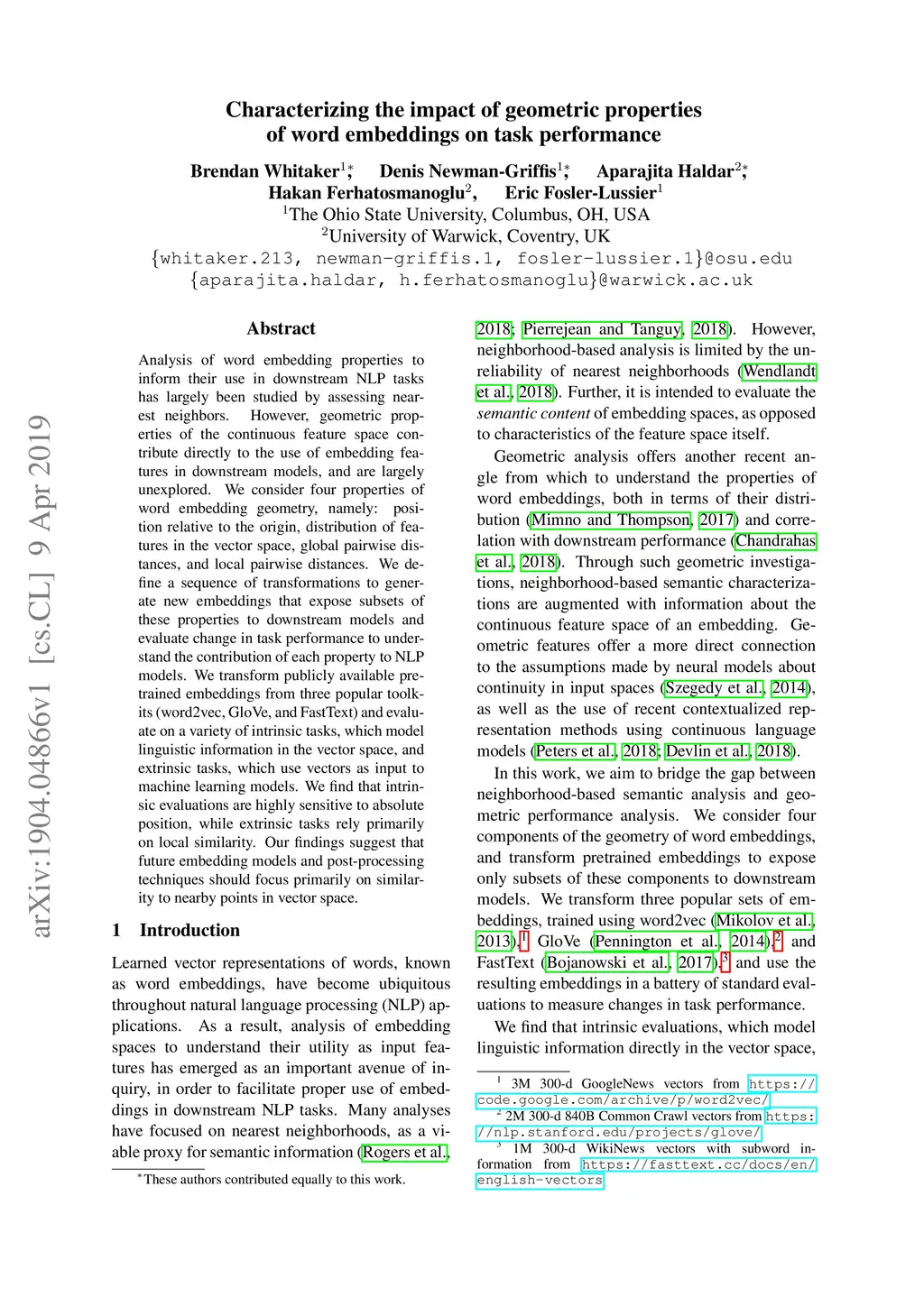 Analysis of word embedding properties to inform their use in downstream NLP tasks has largely been studied by assessing nearest neighbors. However, geometric properties of the continuous feature space contribute directly to the use of embedding features in downstream models, and are largely unexplored. We consider four properties of word embedding geometry, namely: position relative to the origin, distribution of features in the vector space, global pairwise distances, and local pairwise distances. We define a sequence of transformations to generate new embeddings that expose subsets of these properties to downstream models and evaluate change in task performance to understand the contribution of each property to NLP models. We transform publicly available pretrained embeddings from three popular toolkits (word2vec, GloVe, and FastText) and evaluate on a variety of intrinsic tasks, which model linguistic information in the vector space, and extrinsic tasks, which use vectors as input to machine learning models. We find that intrinsic evaluations are highly sensitive to absolute position, while extrinsic tasks rely primarily on local similarity. Our findings suggest that future embedding models and post-processing techniques should focus primarily on similarity to nearby points in vector space.