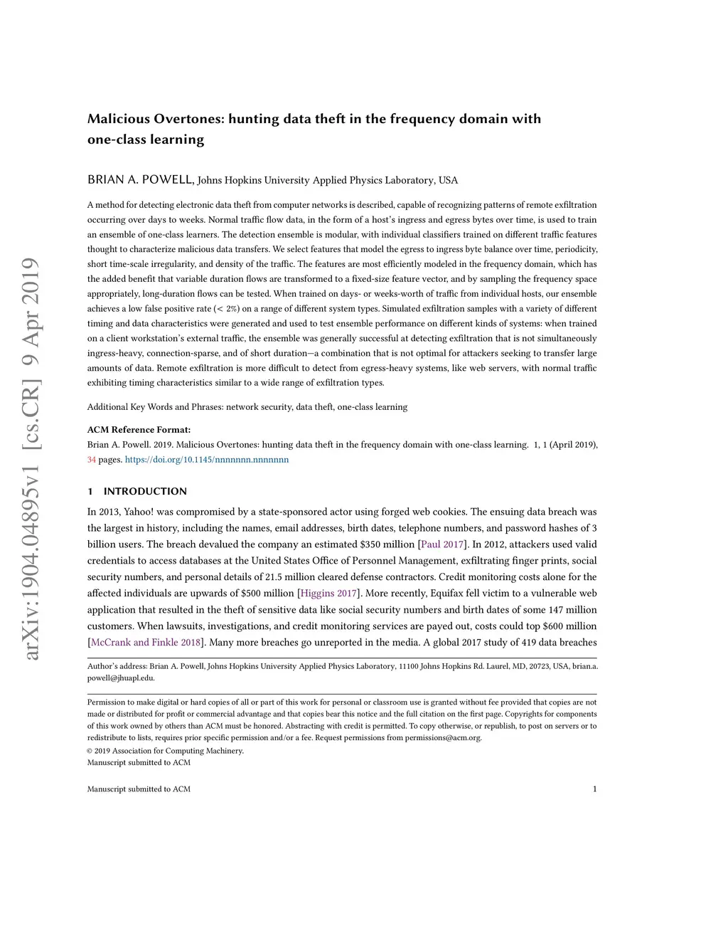A method for detecting electronic data theft from computer networks is described, capable of recognizing patterns of remote exfiltration occurring over days to weeks. Normal traffic flow data, in the form of a host's ingress and egress bytes over time, is used to train an ensemble of one-class learners. The detection ensemble is modular, with individual classifiers trained on different traffic features thought to characterize malicious data transfers. We select features that model the egress to ingress byte balance over time, periodicity, short time-scale irregularity, and density of the traffic. The features are most efficiently modeled in the frequency domain, which has the added benefit that variable duration flows are transformed to a fixed-size feature vector, and by sampling the frequency space appropriately, long-duration flows can be tested. When trained on days- or weeks-worth of traffic from individual hosts, our ensemble achieves a low false positive rate (<2%) on a range of different system types. Simulated exfiltration samples with a variety of different timing and data characteristics were generated and used to test ensemble performance on different kinds of systems: when trained on a client workstation's external traffic, the ensemble was generally successful at detecting exfiltration that is not simultaneously ingress-heavy, connection-sparse, and of short duration---a combination that is not optimal for attackers seeking to transfer large amounts of data. Remote exfiltration is more difficult to detect from egress-heavy systems, like web servers, with normal traffic exhibiting timing characteristics similar to a wide range of exfiltration types.