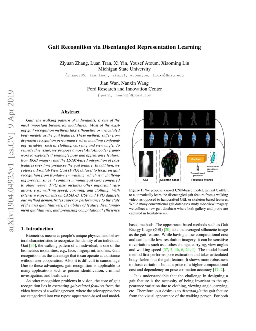 Gait, the walking pattern of individuals, is one of the most important biometrics modalities. Most of the existing gait recognition methods take silhouettes or articulated body models as the gait features. These methods suffer from degraded recognition performance when handling confounding variables, such as clothing, carrying and view angle. To remedy this issue, we propose a novel AutoEncoder framework to explicitly disentangle pose and appearance features from RGB imagery and the LSTM-based integration of pose features over time produces the gait feature. In addition, we collect a Frontal-View Gait (FVG) dataset to focus on gait recognition from frontal-view walking, which is a challenging problem since it contains minimal gait cues compared to other views. FVG also includes other important variations, e.g., walking speed, carrying, and clothing. With extensive experiments on CASIA-B, USF and FVG datasets, our method demonstrates superior performance to the state of the arts quantitatively, the ability of feature disentanglement qualitatively, and promising computational efficiency.