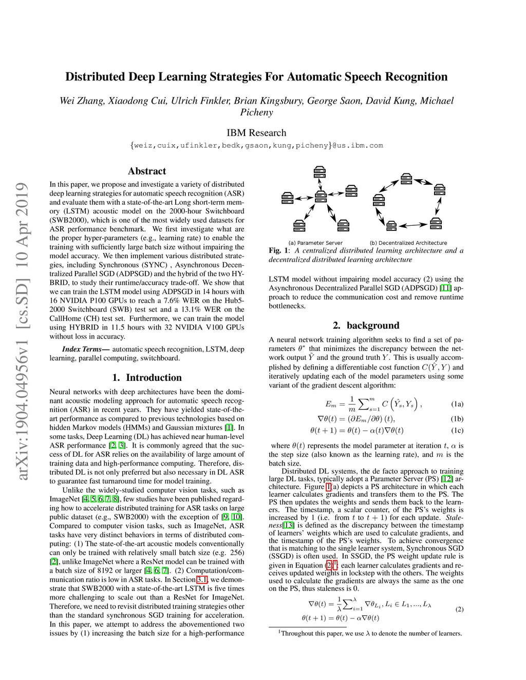 In this paper, we propose and investigate a variety of distributed deep learning strategies for automatic speech recognition (ASR) and evaluate them with a state-of-the-art Long short-term memory (LSTM) acoustic model on the 2000-hour Switchboard (SWB2000), which is one of the most widely used datasets for ASR performance benchmark. We first investigate what are the proper hyper-parameters (e.g., learning rate) to enable the training with sufficiently large batch size without impairing the model accuracy. We then implement various distributed strategies, including Synchronous (SYNC), Asynchronous Decentralized Parallel SGD (ADPSGD) and the hybrid of the two HYBRID, to study their runtime/accuracy trade-off. We show that we can train the LSTM model using ADPSGD in 14 hours with 16 NVIDIA P100 GPUs to reach a 7.6% WER on the Hub5- 2000 Switchboard (SWB) test set and a 13.1% WER on the CallHome (CH) test set. Furthermore, we can train the model using HYBRID in 11.5 hours with 32 NVIDIA V100 GPUs without loss in accuracy.