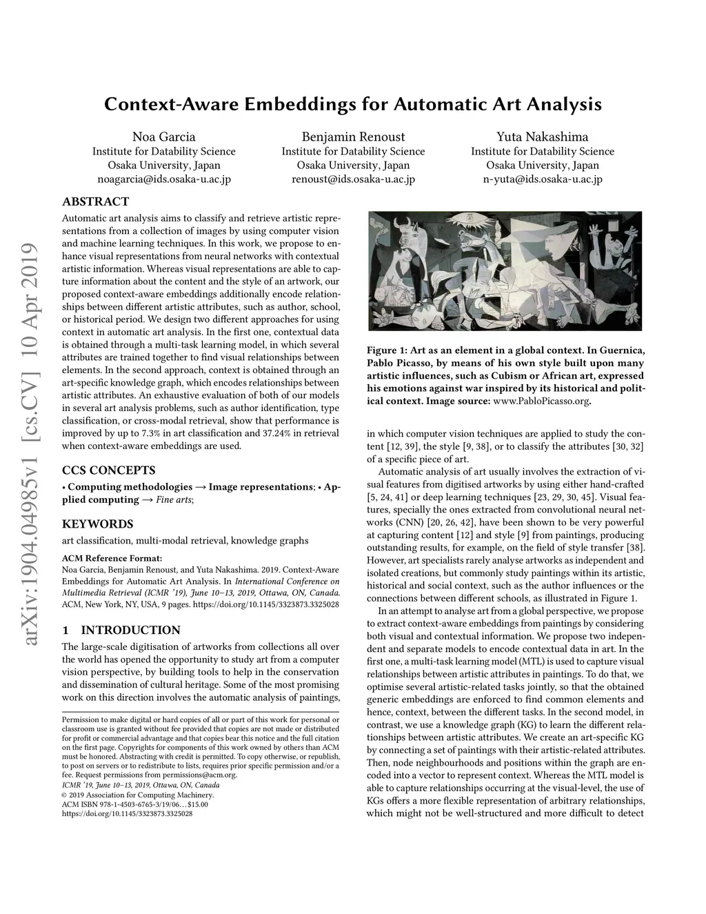 Automatic art analysis aims to classify and retrieve artistic representations from a collection of images by using computer vision and machine learning techniques. In this work, we propose to enhance visual representations from neural networks with contextual artistic information. Whereas visual representations are able to capture information about the content and the style of an artwork, our proposed context-aware embeddings additionally encode relationships between different artistic attributes, such as author, school, or historical period. We design two different approaches for using context in automatic art analysis. In the first one, contextual data is obtained through a multi-task learning model, in which several attributes are trained together to find visual relationships between elements. In the second approach, context is obtained through an art-specific knowledge graph, which encodes relationships between artistic attributes. An exhaustive evaluation of both of our models in several art analysis problems, such as author identification, type classification, or cross-modal retrieval, show that performance is improved by up to 7.3% in art classification and 37.24% in retrieval when context-aware embeddings are used.