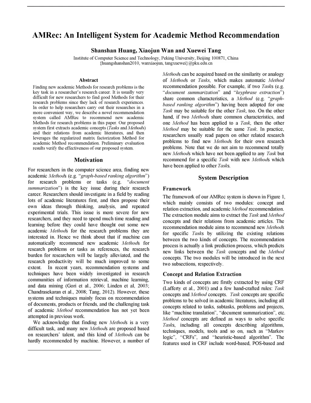 Finding new academic Methods for research problems is the key task in a researcher's research career. It is usually very difficult for new researchers to find good Methods for their research problems since they lack of research experiences. In order to help researchers carry out their researches in a more convenient way, we describe a novel recommendation system called AMRec to recommend new academic Methods for research problems in this paper. Our proposed system first extracts academic concepts (Tasks and Methods) and their relations from academic literatures, and then leverages the regularized matrix factorization Method for academic Method recommendation. Preliminary evaluation results verify the effectiveness of our proposed system.