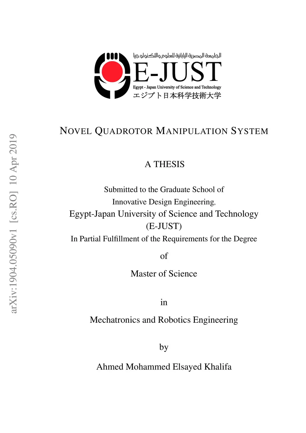This thesis introduces a novel quadrotor manipulation system that consists of 2-link manipulator attached to the bottom of a quadrotor. This new system presents a solution for the drawbacks found in the current quadrotor manipulation system which uses a gripper fixed to a quadrotor. Unlike the current system, the proposed system has a 6-DOF, and it provides enough distance between the quadrotor and the object. System kinematics and dynamics are derived. To study the feasibility of the proposed system, a quadrotor with high enough payload to add the 2-link manipulator is constructed. Its parameters are identified to be used in the simulation and controller design. A CAD model is developed to calculate the mass and moments of inertia in an accurate way. Direct relationships between Pulse Width Modulation and each of the angular speeds, thrust forces, and drag moments of the rotors are identified. A Direction Cosine Matrix complementary filter is used to estimate the attitude of the quadrotor using the IMU measurements. Attitude stabilization controller is designed based on feedback linearization technique to test the identified parameters and the attitude estimation. The results of the experiments show satisfactory accuracy of the identified structure parameters, the identified rotor assembly parameters, and the attitude estimation algorithm. A controller for the proposed system is designed based on three control techniques: feedback linearization based PID control, direct fuzzy logic control, and fuzzy model reference learning control. These controllers are tested to provide system stability and trajectory tracking under the effect of picking and placing a payload and the effect of changing the operating region. Simulation results show that the fuzzy model reference learning control technique has superior performance. The results indicate the feasibility of the proposed system.