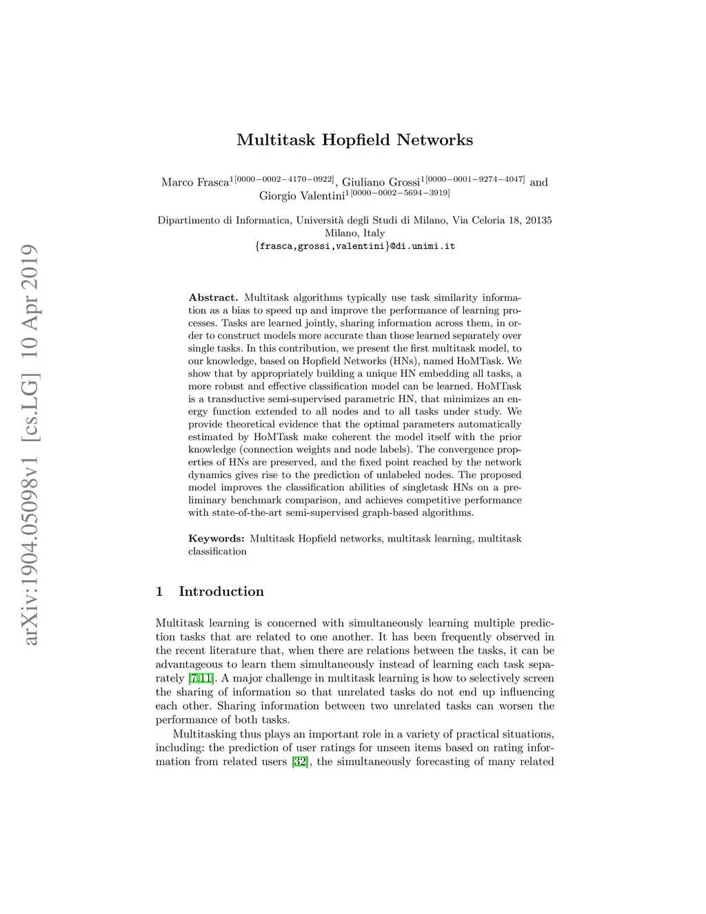 Multitask algorithms typically use task similarity information as a bias to speed up and improve the performance of learning processes. Tasks are learned jointly, sharing information across them, in order to construct models more accurate than those learned separately over single tasks. In this contribution, we present the first multitask model, to our knowledge, based on Hopfield Networks (HNs), named HoMTask. We show that by appropriately building a unique HN embedding all tasks, a more robust and effective classification model can be learned. HoMTask is a transductive semi-supervised parametric HN, that minimizes an energy function extended to all nodes and to all tasks under study. We provide theoretical evidence that the optimal parameters automatically estimated by HoMTask make coherent the model itself with the prior knowledge (connection weights and node labels). The convergence properties of HNs are preserved, and the fixed point reached by the network dynamics gives rise to the prediction of unlabeled nodes. The proposed model improves the classification abilities of singletask HNs on a preliminary benchmark comparison, and achieves competitive performance with state-of-the-art semi-supervised graph-based algorithms.