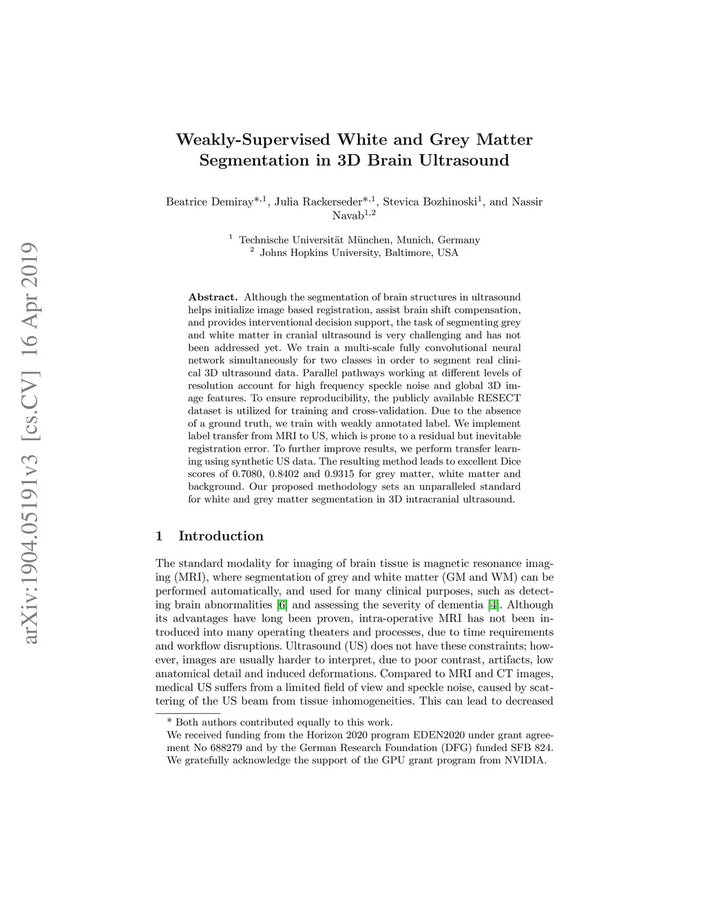 Although the segmentation of brain structures in ultrasound helps initialize image based registration, assist brain shift compensation, and provides interventional decision support, the task of segmenting grey and white matter in cranial ultrasound is very challenging and has not been addressed yet. We train a multi-scale fully convolutional neural network simultaneously for two classes in order to segment real clinical 3D ultrasound data. Parallel pathways working at different levels of resolution account for high frequency speckle noise and global 3D image features. To ensure reproducibility, the publicly available RESECT dataset is utilized for training and cross-validation. Due to the absence of a ground truth, we train with weakly annotated label. We implement label transfer from MRI to US, which is prone to a residual but inevitable registration error. To further improve results, we perform transfer learning using synthetic US data. The resulting method leads to excellent Dice scores of 0.7080, 0.8402 and 0.9315 for grey matter, white matter and background. Our proposed methodology sets an unparalleled standard for white and grey matter segmentation in 3D intracranial ultrasound.