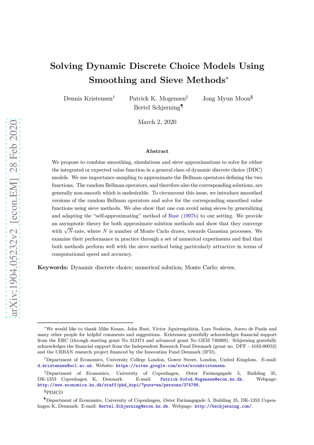 We propose to combine smoothing, simulations and sieve approximations to solve for either the integrated or expected value function in a general class of dynamic discrete choice (DDC) models. We use importance sampling to approximate the Bellman operators defining the two functions. The random Bellman operators, and therefore also the corresponding solutions, are generally non-smooth which is undesirable. To circumvent this issue, we introduce a smoothed version of the random Bellman operator and solve for the corresponding smoothed value function using sieve methods. We show that one can avoid using sieves by generalizing and adapting the `self-approximating' method of Rust (1997) to our setting. We provide an asymptotic theory for the approximate solutions and show that they converge with root-N-rate, where is number of Monte Carlo draws, towards Gaussian processes. We examine their performance in practice through a set of numerical experiments and find that both methods perform well with the sieve method being particularly attractive in terms of computational speed and accuracy.