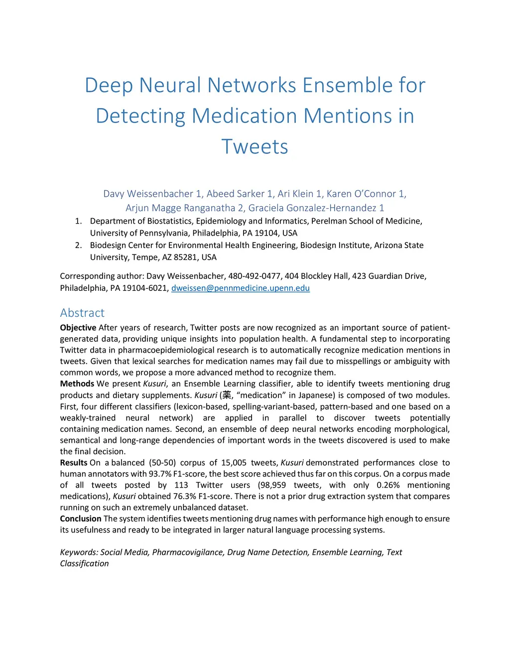Objective: After years of research, Twitter posts are now recognized as an important source of patient-generated data, providing unique insights into population health. A fundamental step to incorporating Twitter data in pharmacoepidemiological research is to automatically recognize medication mentions in tweets. Given that lexical searches for medication names may fail due to misspellings or ambiguity with common words, we propose a more advanced method to recognize them. Methods: We present Kusuri, an Ensemble Learning classifier, able to identify tweets mentioning drug products and dietary supplements. Kusuri ("medication" in Japanese) is composed of two modules. First, four different classifiers (lexicon-based, spelling-variant-based, pattern-based and one based on a weakly-trained neural network) are applied in parallel to discover tweets potentially containing medication names. Second, an ensemble of deep neural networks encoding morphological, semantical and long-range dependencies of important words in the tweets discovered is used to make the final decision. Results: On a balanced (50-50) corpus of 15,005 tweets, Kusuri demonstrated performances close to human annotators with 93.7% F1-score, the best score achieved thus far on this corpus. On a corpus made of all tweets posted by 113 Twitter users (98,959 tweets, with only 0.26% mentioning medications), Kusuri obtained 76.3% F1-score. There is not a prior drug extraction system that compares running on such an extremely unbalanced dataset. Conclusion: The system identifies tweets mentioning drug names with performance high enough to ensure its usefulness and ready to be integrated in larger natural language processing systems.