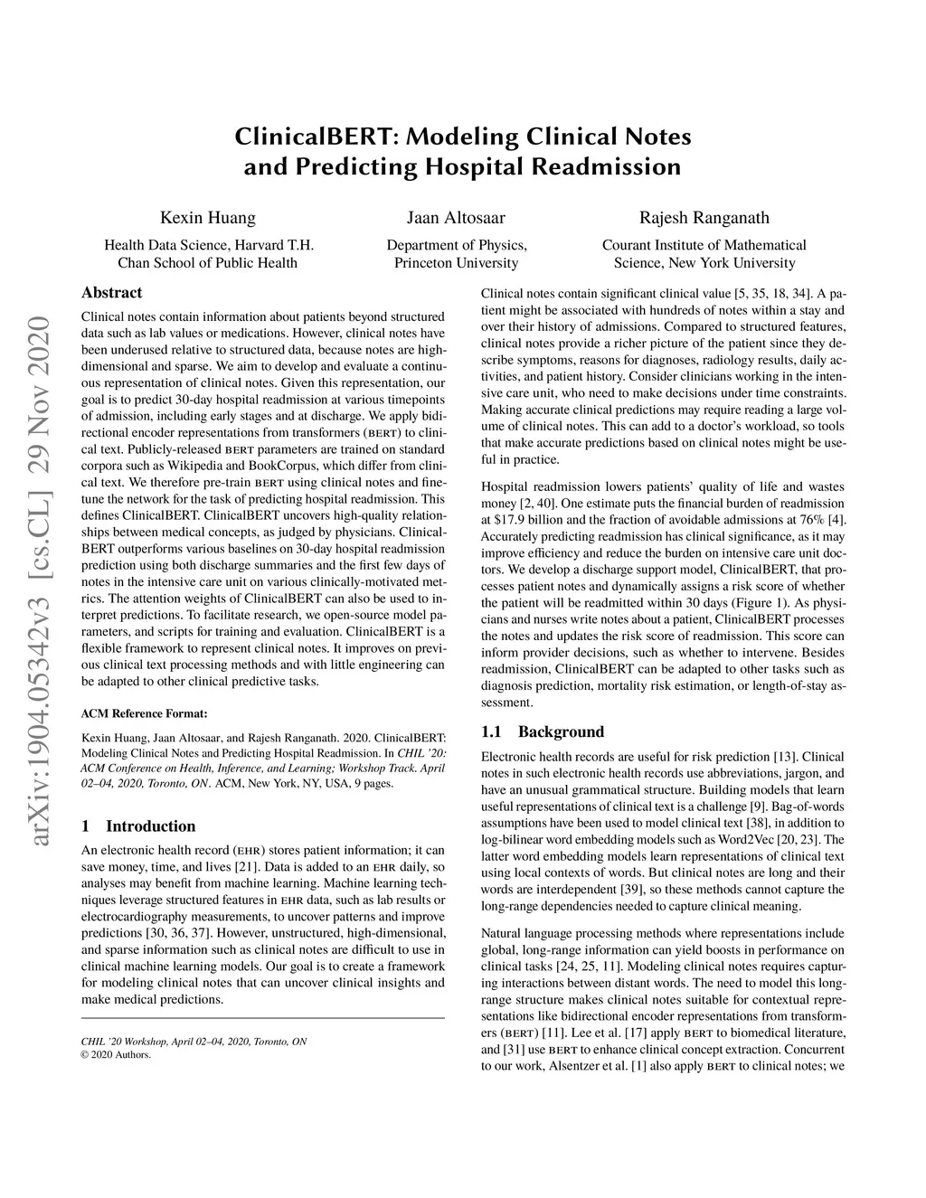 ClinicalBERT: Modeling Clinical Notes and Predicting Hospital