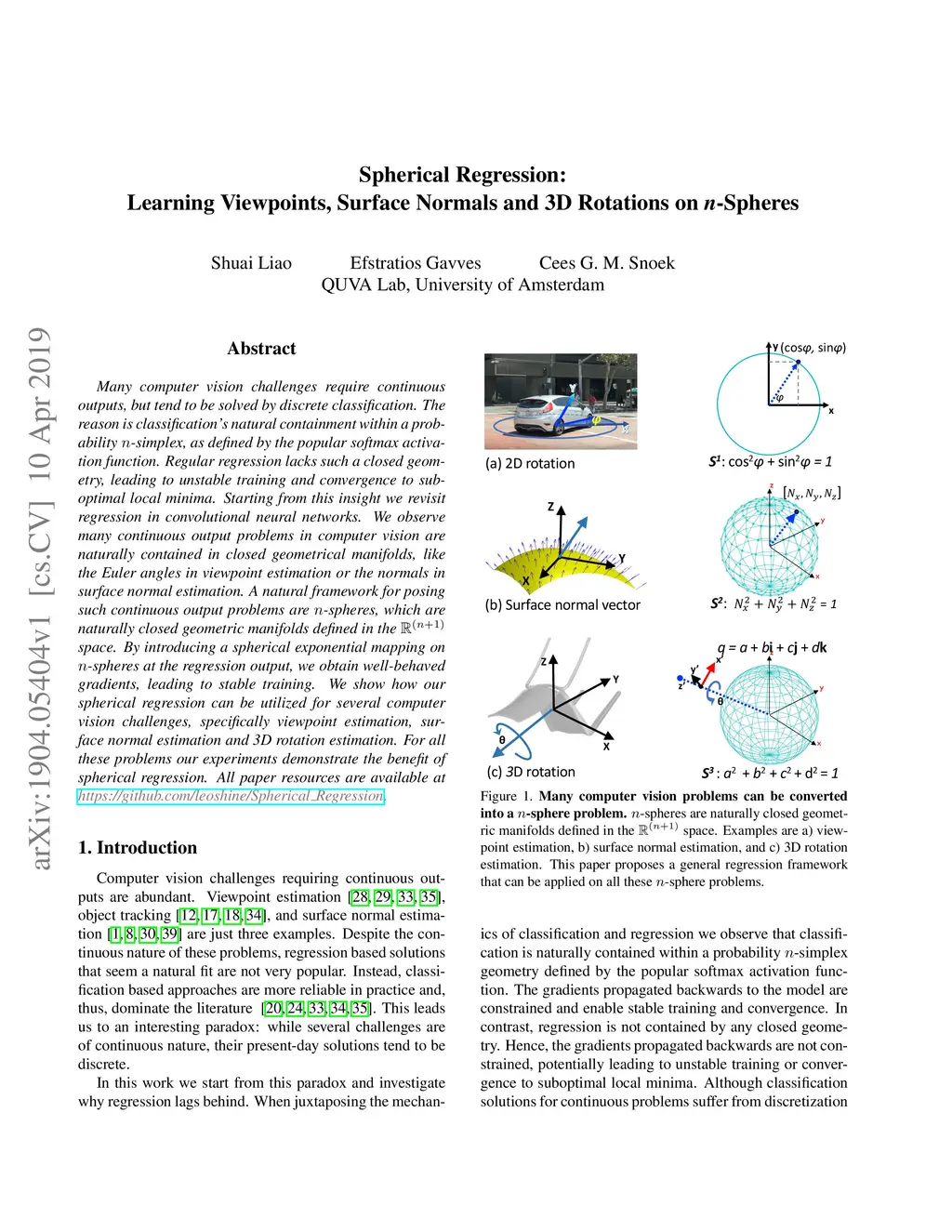 Many computer vision challenges require continuous outputs, but tend to be solved by discrete classification. The reason is classification's natural containment within a probability -simplex, as defined by the popular softmax activation function. Regular regression lacks such a closed geometry, leading to unstable training and convergence to suboptimal local minima. Starting from this insight we revisit regression in convolutional neural networks. We observe many continuous output problems in computer vision are naturally contained in closed geometrical manifolds, like the Euler angles in viewpoint estimation or the normals in surface normal estimation. A natural framework for posing such continuous output problems are -spheres, which are naturally closed geometric manifolds defined in the space. By introducing a spherical exponential mapping on -spheres at the regression output, we obtain well-behaved gradients, leading to stable training. We show how our spherical regression can be utilized for several computer vision challenges, specifically viewpoint estimation, surface normal estimation and 3D rotation estimation. For all these problems our experiments demonstrate the benefit of spherical regression. All paper resources are available at https://github.com/leoshine/Spherical_Regression.