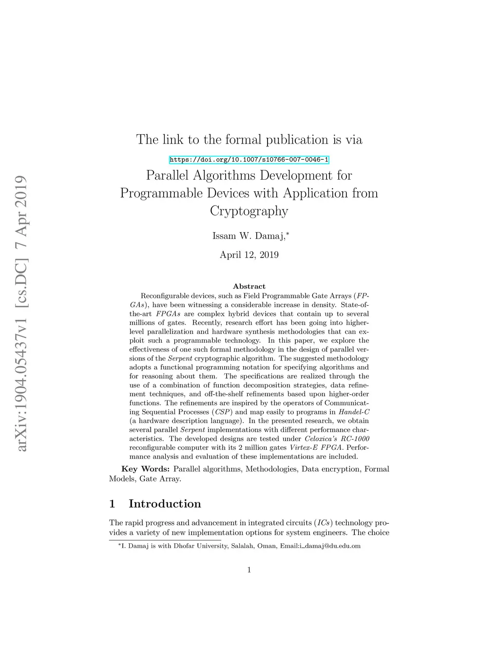Reconfigurable devices, such as Field Programmable Gate Arrays (FPGAs), have been witnessing a considerable increase in density. State-of-the-art FPGAs are complex hybrid devices that contain up to several millions of gates. Recently, research effort has been going into higher-level parallelization and hardware synthesis methodologies that can exploit such a programmable technology. In this paper, we explore the effectiveness of one such formal methodology in the design of parallel versions of the Serpent cryptographic algorithm. The suggested methodology adopts a functional programming notation for specifying algorithms and for reasoning about them. The specifications are realized through the use of a combination of function decomposition strategies, data refinement techniques, and off-the-shelf refinements based upon higher-order functions. The refinements are inspired by the operators of Communicating Sequential Processes (CSP) and map easily to programs in Handel-C (a hardware description language). In the presented research, we obtain several parallel Serpent implementations with different performance characteristics. The developed designs are tested under Celoxica's RC-1000 reconfigurable computer with its 2 million gates Virtex-E FPGA. Performance analysis and evaluation of these implementations are included.
