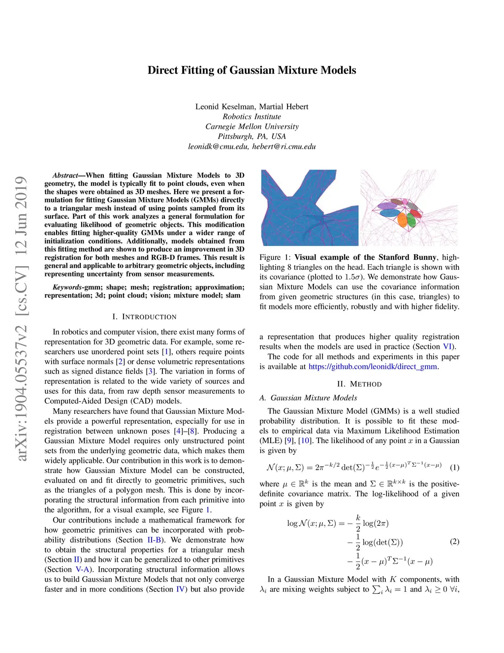 When fitting Gaussian Mixture Models to 3D geometry, the model is typically fit to point clouds, even when the shapes were obtained as 3D meshes. Here we present a formulation for fitting Gaussian Mixture Models (GMMs) directly to a triangular mesh instead of using points sampled from its surface. Part of this work analyzes a general formulation for evaluating likelihood of geometric objects. This modification enables fitting higher-quality GMMs under a wider range of initialization conditions. Additionally, models obtained from this fitting method are shown to produce an improvement in 3D registration for both meshes and RGB-D frames. This result is general and applicable to arbitrary geometric objects, including representing uncertainty from sensor measurements.