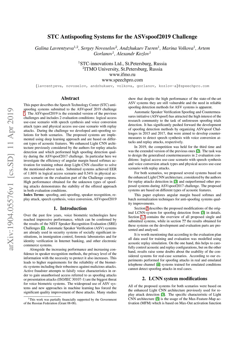 This paper describes the Speech Technology Center (STC) antispoofing systems submitted to the ASVspoof 2019 challenge. The ASVspoof2019 is the extended version of the previous challenges and includes 2 evaluation conditions: logical access use-case scenario with speech synthesis and voice conversion attack types and physical access use-case scenario with replay attacks. During the challenge we developed anti-spoofing solutions for both scenarios. The proposed systems are implemented using deep learning approach and are based on different types of acoustic features. We enhanced Light CNN architecture previously considered by the authors for replay attacks detection and which performed high spoofing detection quality during the ASVspoof2017 challenge. In particular here we investigate the efficiency of angular margin based softmax activation for training robust deep Light CNN classifier to solve the mentioned-above tasks. Submitted systems achieved EER of 1.86% in logical access scenario and 0.54% in physical access scenario on the evaluation part of the Challenge corpora. High performance obtained for the unknown types of spoofing attacks demonstrates the stability of the offered approach in both evaluation conditions.