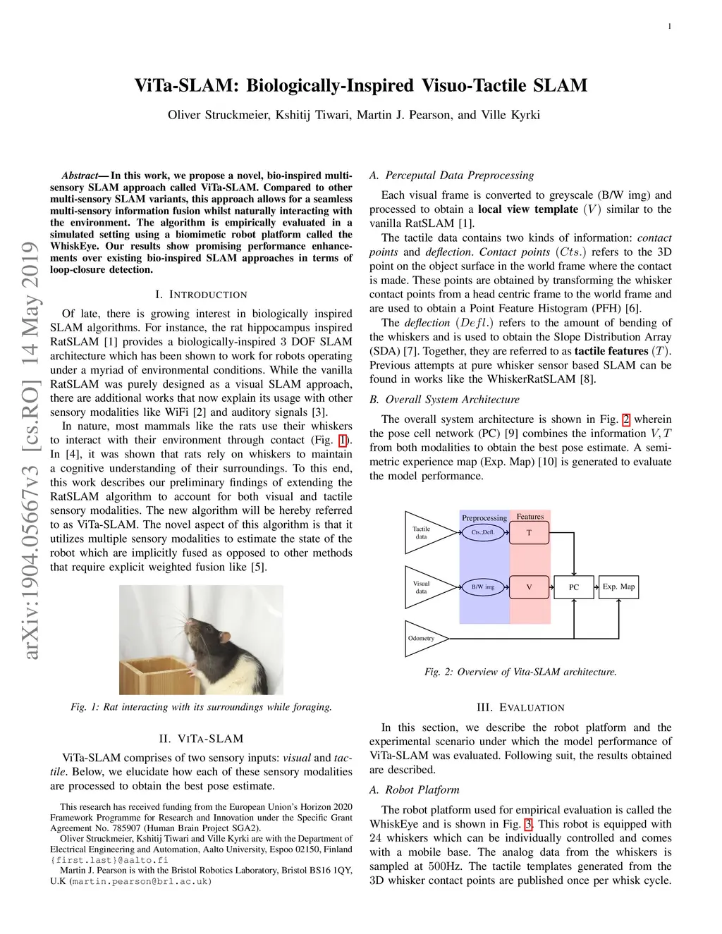 In this work, we propose a novel, bio-inspired multi-sensory SLAM approach called ViTa-SLAM. Compared to other multisensory SLAM variants, this approach allows for a seamless multi-sensory information fusion whilst naturally interacting with the environment. The algorithm is empirically evaluated in a simulated setting using a biomimetic robot platform called the WhiskEye. Our results show promising performance enhancements over existing bio-inspired SLAM approaches in terms of loop-closure detection.
