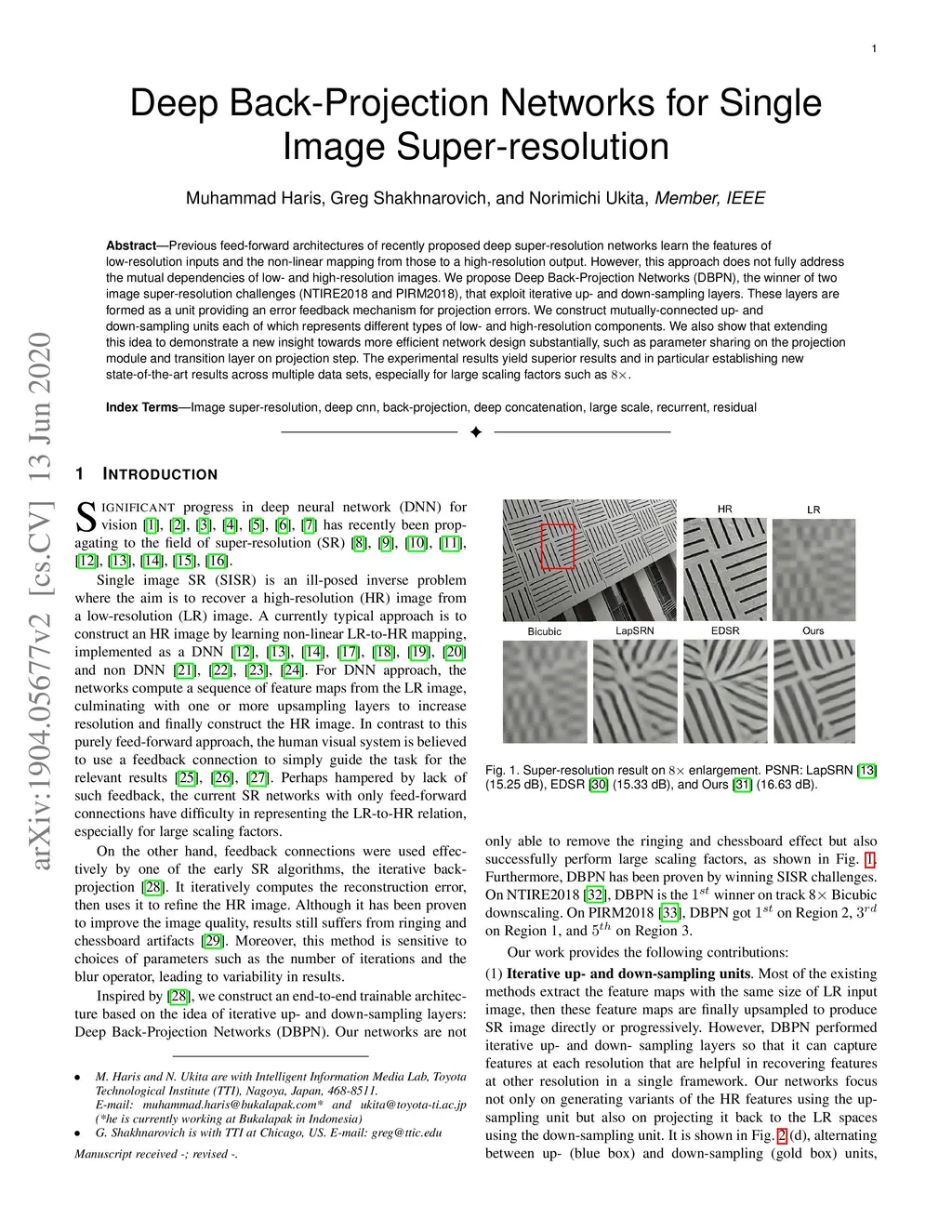 Previous feed-forward architectures of recently proposed deep super-resolution networks learn the features of low-resolution inputs and the non-linear mapping from those to a high-resolution output. However, this approach does not fully address the mutual dependencies of low- and high-resolution images. We propose Deep Back-Projection Networks (DBPN), the winner of two image super-resolution challenges (NTIRE2018 and PIRM2018), that exploit iterative up- and down-sampling layers. These layers are formed as a unit providing an error feedback mechanism for projection errors. We construct mutually-connected up- and down-sampling units each of which represents different types of low- and high-resolution components. We also show that extending this idea to demonstrate a new insight towards more efficient network design substantially, such as parameter sharing on the projection module and transition layer on projection step. The experimental results yield superior results and in particular establishing new state-of-the-art results across multiple data sets, especially for large scaling factors such as 8x.