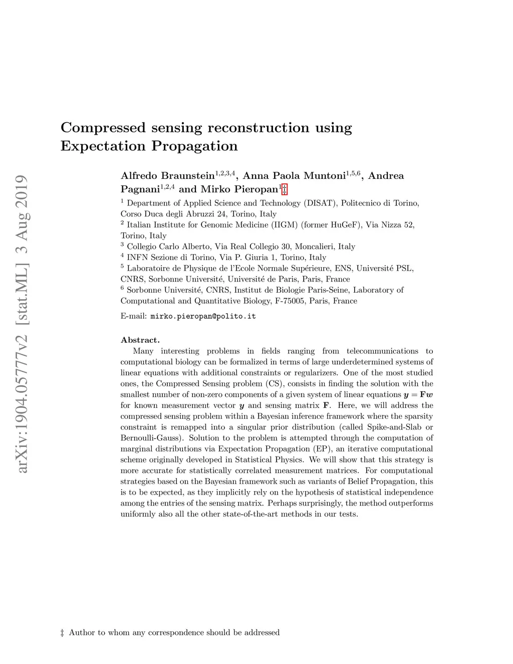 Many interesting problems in fields ranging from telecommunications to computational biology can be formalized in terms of large underdetermined systems of linear equations with additional constraints or regularizers. One of the most studied ones, the Compressed Sensing problem (CS), consists in finding the solution with the smallest number of non-zero components of a given system of linear equations for known measurement vector and sensing matrix . Here, we will address the compressed sensing problem within a Bayesian inference framework where the sparsity constraint is remapped into a singular prior distribution (called Spike-and-Slab or Bernoulli-Gauss). Solution to the problem is attempted through the computation of marginal distributions via Expectation Propagation (EP), an iterative computational scheme originally developed in Statistical Physics. We will show that this strategy is comparatively more accurate than the alternatives in solving instances of CS generated from statistically correlated measurement matrices. For computational strategies based on the Bayesian framework such as variants of Belief Propagation, this is to be expected, as they implicitly rely on the hypothesis of statistical independence among the entries of the sensing matrix. Perhaps surprisingly, the method outperforms uniformly also all the other state-of-the-art methods in our tests.