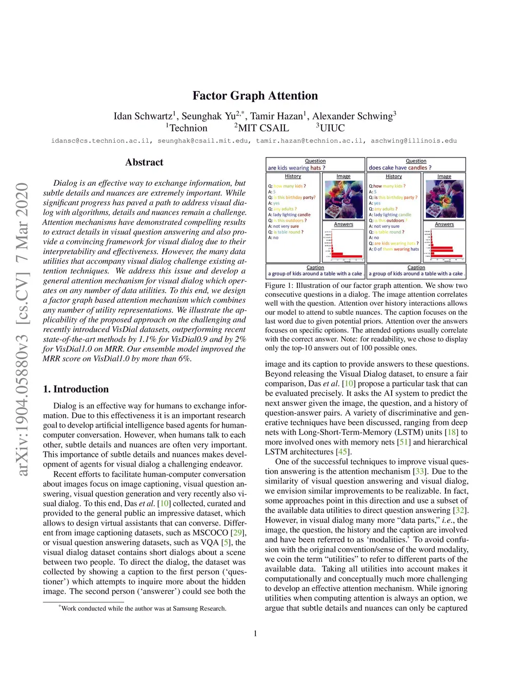 Dialog is an effective way to exchange information, but subtle details and nuances are extremely important. While significant progress has paved a path to address visual dialog with algorithms, details and nuances remain a challenge. Attention mechanisms have demonstrated compelling results to extract details in visual question answering and also provide a convincing framework for visual dialog due to their interpretability and effectiveness. However, the many data utilities that accompany visual dialog challenge existing attention techniques. We address this issue and develop a general attention mechanism for visual dialog which operates on any number of data utilities. To this end, we design a factor graph based attention mechanism which combines any number of utility representations. We illustrate the applicability of the proposed approach on the challenging and recently introduced VisDial datasets, outperforming recent state-of-the-art methods by 1.1% for VisDial0.9 and by 2% for VisDial1.0 on MRR. Our ensemble model improved the MRR score on VisDial1.0 by more than 6%.