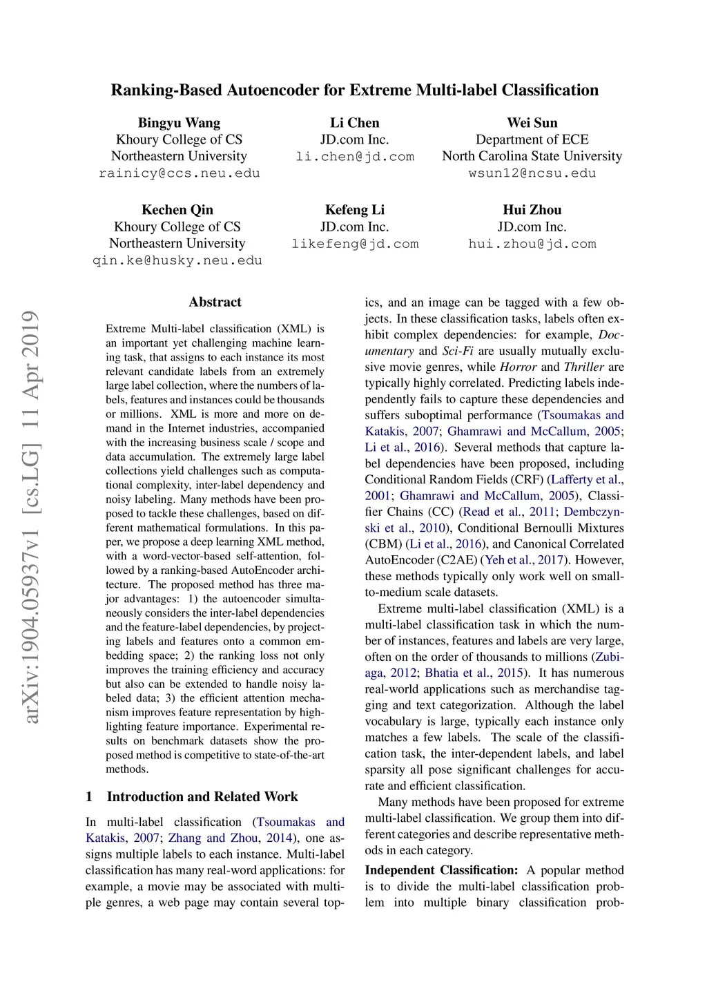 Extreme Multi-label classification (XML) is an important yet challenging machine learning task, that assigns to each instance its most relevant candidate labels from an extremely large label collection, where the numbers of labels, features and instances could be thousands or millions. XML is more and more on demand in the Internet industries, accompanied with the increasing business scale / scope and data accumulation. The extremely large label collections yield challenges such as computational complexity, inter-label dependency and noisy labeling. Many methods have been proposed to tackle these challenges, based on different mathematical formulations. In this paper, we propose a deep learning XML method, with a word-vector-based self-attention, followed by a ranking-based AutoEncoder architecture. The proposed method has three major advantages: 1) the autoencoder simultaneously considers the inter-label dependencies and the feature-label dependencies, by projecting labels and features onto a common embedding space; 2) the ranking loss not only improves the training efficiency and accuracy but also can be extended to handle noisy labeled data; 3) the efficient attention mechanism improves feature representation by highlighting feature importance. Experimental results on benchmark datasets show the proposed method is competitive to state-of-the-art methods.