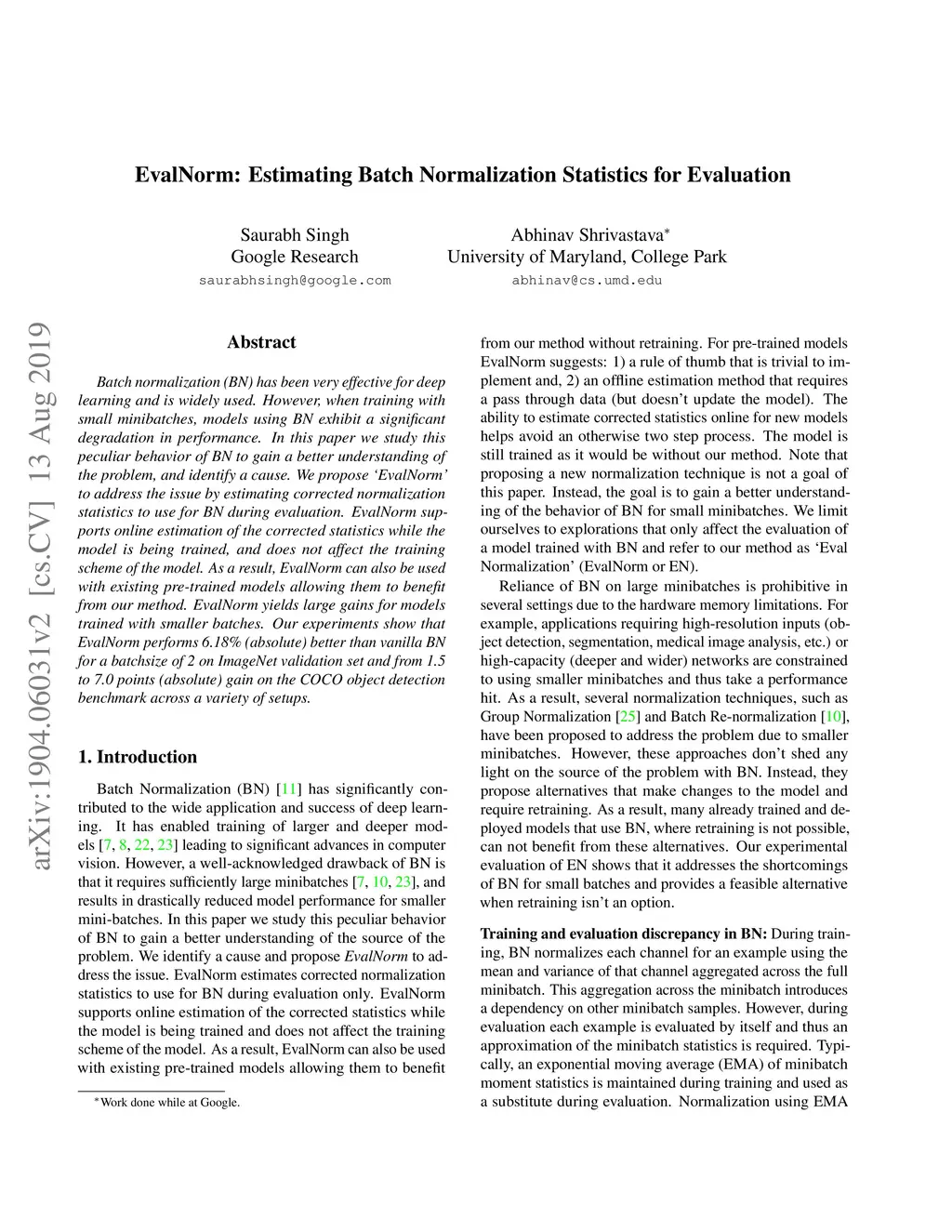 Batch normalization (BN) has been very effective for deep learning and is widely used. However, when training with small minibatches, models using BN exhibit a significant degradation in performance. In this paper we study this peculiar behavior of BN to gain a better understanding of the problem, and identify a cause. We propose ÉvalNorm' to address the issue by estimating corrected normalization statistics to use for BN during evaluation. EvalNorm supports online estimation of the corrected statistics while the model is being trained, and does not affect the training scheme of the model. As a result, EvalNorm can also be used with existing pre-trained models allowing them to benefit from our method. EvalNorm yields large gains for models trained with smaller batches. Our experiments show that EvalNorm performs 6.18% (absolute) better than vanilla BN for a batchsize of 2 on ImageNet validation set and from 1.5 to 7.0 points (absolute) gain on the COCO object detection benchmark across a variety of setups.
