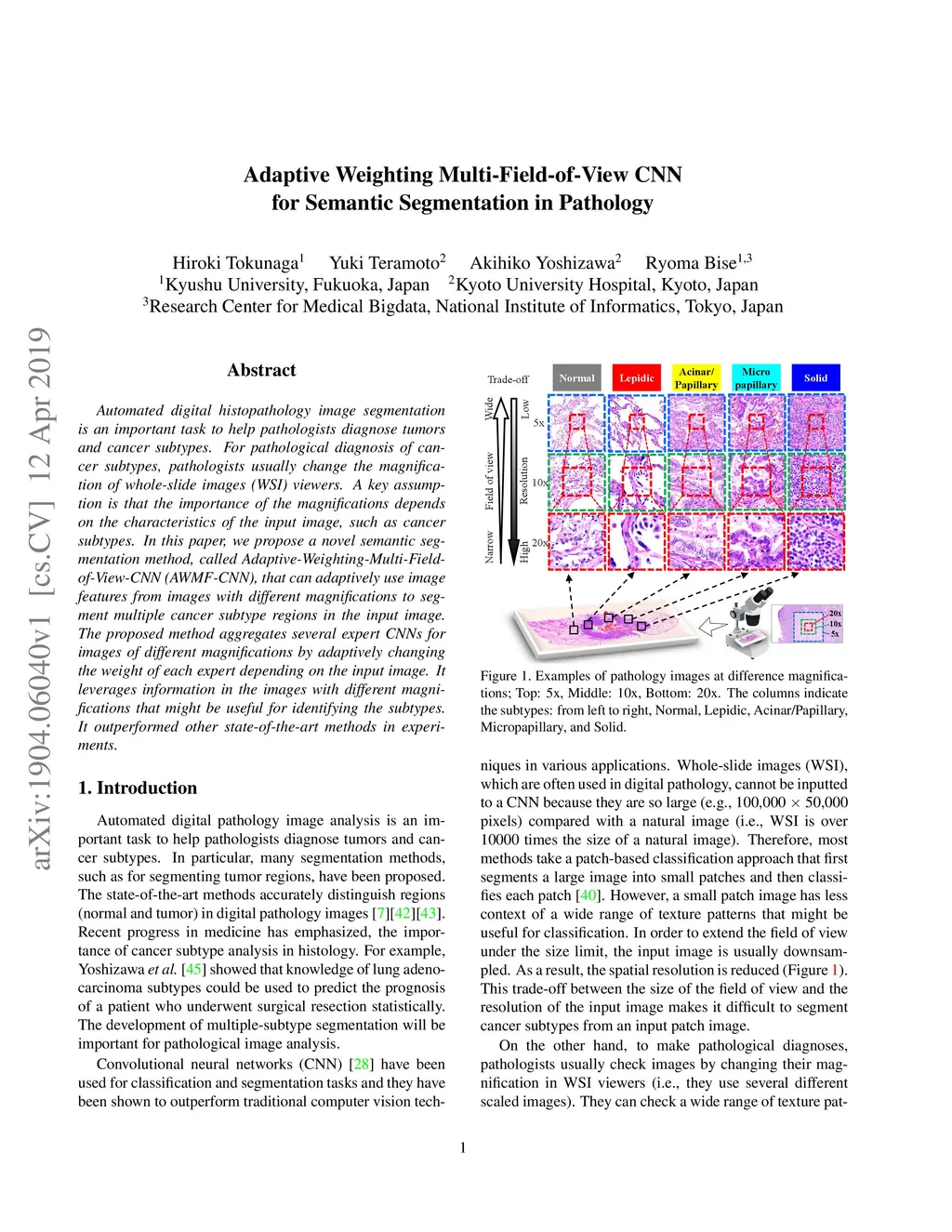 Automated digital histopathology image segmentation is an important task to help pathologists diagnose tumors and cancer subtypes. For pathological diagnosis of cancer subtypes, pathologists usually change the magnification of whole-slide images (WSI) viewers. A key assumption is that the importance of the magnifications depends on the characteristics of the input image, such as cancer subtypes. In this paper, we propose a novel semantic segmentation method, called Adaptive-Weighting-Multi-Field-of-View-CNN (AWMF-CNN), that can adaptively use image features from images with different magnifications to segment multiple cancer subtype regions in the input image. The proposed method aggregates several expert CNNs for images of different magnifications by adaptively changing the weight of each expert depending on the input image. It leverages information in the images with different magnifications that might be useful for identifying the subtypes. It outperformed other state-of-the-art methods in experiments.