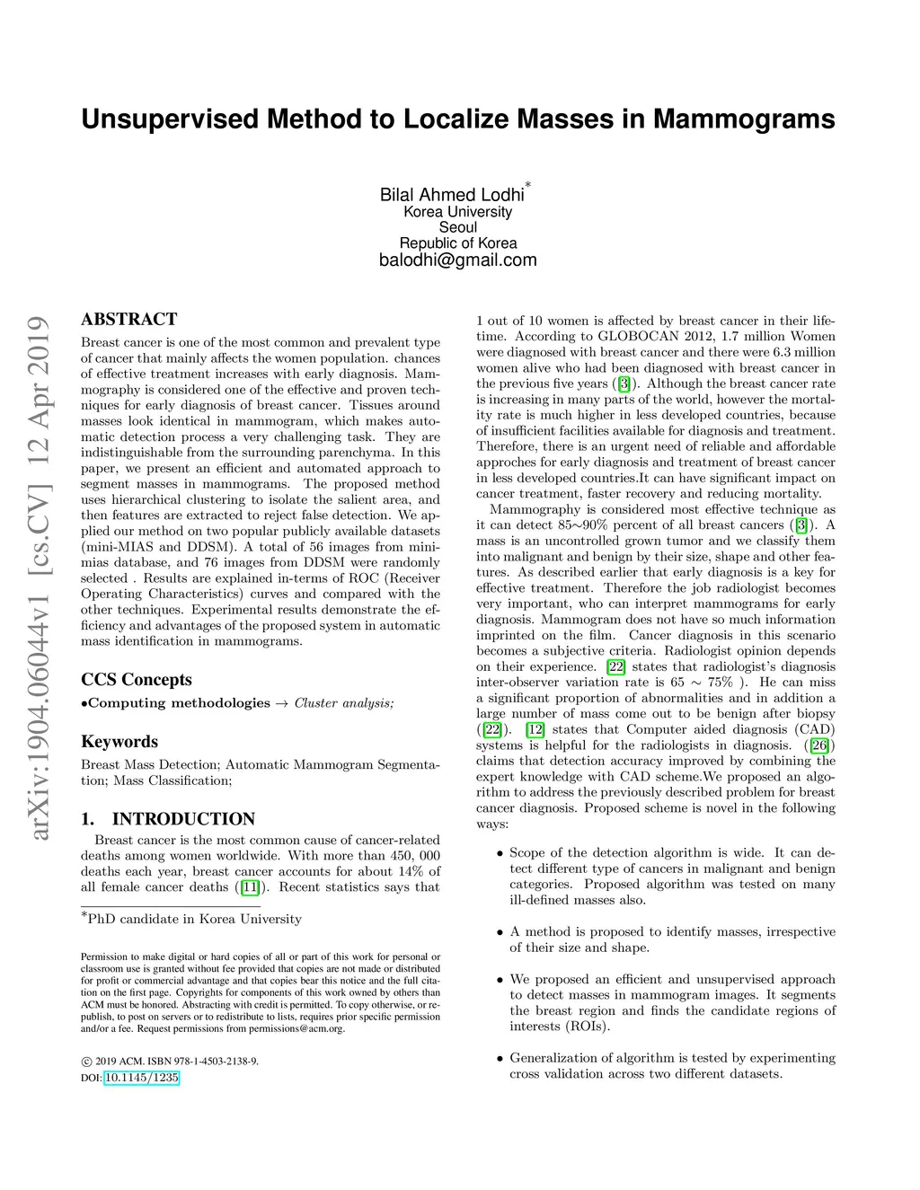 Breast cancer is one of the most common and prevalent type of cancer that mainly affects the women population. chances of effective treatment increases with early diagnosis. Mammography is considered one of the effective and proven techniques for early diagnosis of breast cancer. Tissues around masses look identical in mammogram, which makes automatic detection process a very challenging task. They are indistinguishable from the surrounding parenchyma. In this paper, we present an efficient and automated approach to segment masses in mammograms. The proposed method uses hierarchical clustering to isolate the salient area, and then features are extracted to reject false detection. We applied our method on two popular publicly available datasets (mini-MIAS and DDSM). A total of 56 images from mini-mias database, and 76 images from DDSM were randomly selected. Results are explained in-terms of ROC (Receiver Operating Characteristics) curves and compared with the other techniques. Experimental results demonstrate the efficiency and advantages of the proposed system in automatic mass identification in mammograms.
