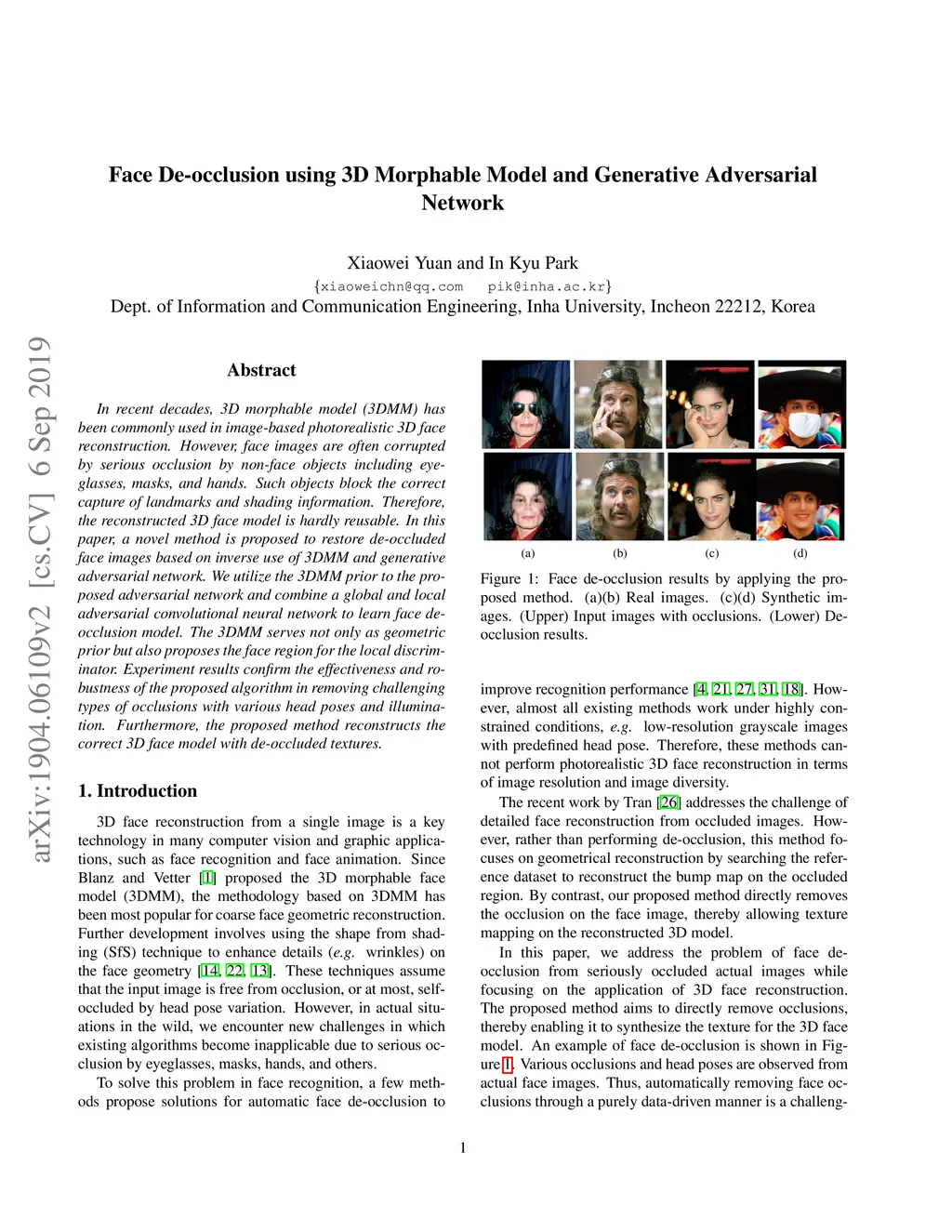 Face De-occlusion using 3D Morphable Model and Generative Adversarial