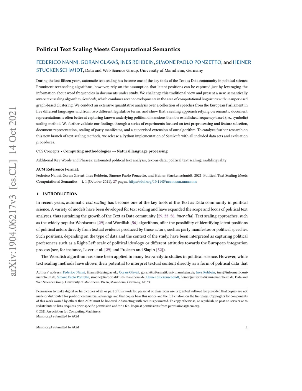 During the last fifteen years, text scaling approaches have become a central element for the text-as-data community. However, they are based on the assumption that latent positions can be captured just by modeling word-frequency information from the different documents under study. We challenge this by presenting a new semantically aware unsupervised scaling algorithm, SemScale, which relies upon distributional representations of the documents under study. We conduct an extensive quantitative analysis over a collection of speeches from the European Parliament in five different languages and from two different legislations, in order to understand whether a) an approach that is aware of semantics would better capture known underlying political dimensions compared to a frequency-based scaling method, b) such positioning correlates in particular with a specific subset of linguistic traits, compared to the use of the entire text, and c) these findings hold across different languages. To support further research on this new branch of text scaling approaches, we release the employed dataset and evaluation setting, an easy-to-use online demo, and a Python implementation of SemScale.