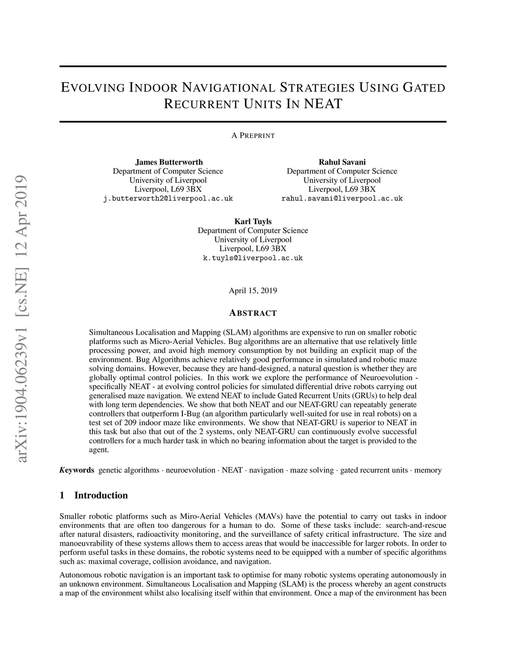 Evolving Indoor Navigational Strategies Using Gated Recurrent Units In