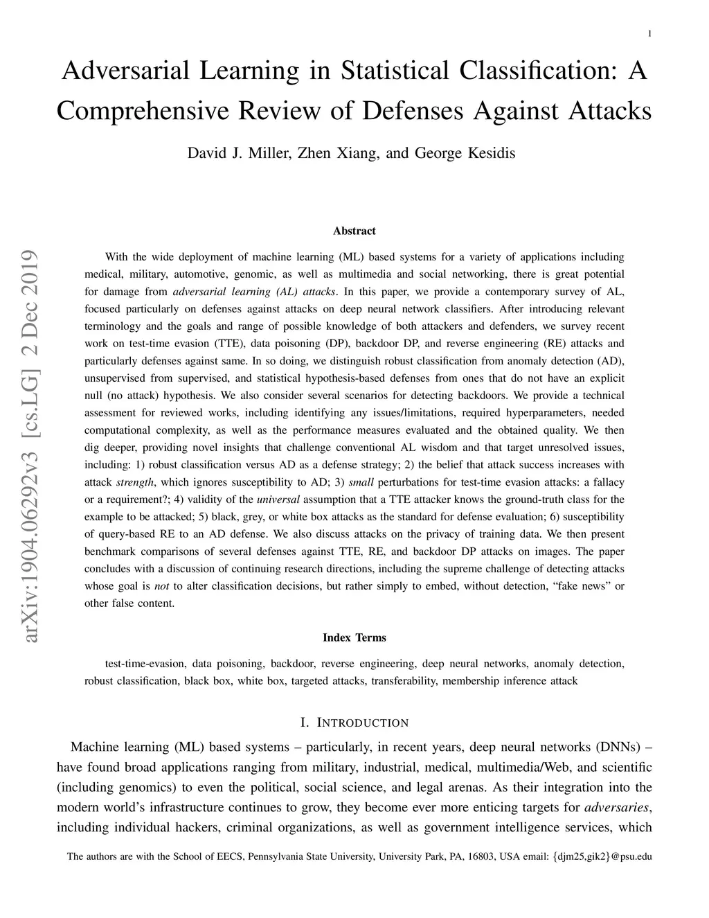 There is great potential for damage from adversarial learning (AL) attacks on machine-learning based systems. In this paper, we provide a contemporary survey of AL, focused particularly on defenses against attacks on statistical classifiers. After introducing relevant terminology and the goals and range of possible knowledge of both attackers and defenders, we survey recent work on test-time evasion (TTE), data poisoning (DP), and reverse engineering (RE) attacks and particularly defenses against same. In so doing, we distinguish robust classification from anomaly detection (AD), unsupervised from supervised, and statistical hypothesis-based defenses from ones that do not have an explicit null (no attack) hypothesis; we identify the hyperparameters a particular method requires, its computational complexity, as well as the performance measures on which it was evaluated and the obtained quality. We then dig deeper, providing novel insights that challenge conventional AL wisdom and that target unresolved issues, including: 1) robust classification versus AD as a defense strategy; 2) the belief that attack success increases with attack strength, which ignores susceptibility to AD; 3) small perturbations for test-time evasion attacks: a fallacy or a requirement?; 4) validity of the universal assumption that a TTE attacker knows the ground-truth class for the example to be attacked; 5) black, grey, or white box attacks as the standard for defense evaluation; 6) susceptibility of query-based RE to an AD defense. We also discuss attacks on the privacy of training data. We then present benchmark comparisons of several defenses against TTE, RE, and backdoor DP attacks on images. The paper concludes with a discussion of future work.