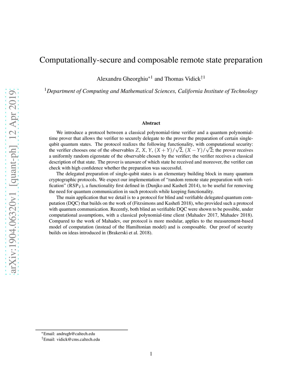 We introduce a protocol between a classical polynomial-time verifier and a quantum polynomial-time prover that allows the verifier to securely delegate to the prover the preparation of certain single-qubit quantum states. The protocol realizes the following functionality, with computational security: the verifier chooses one of the observables , , , , ; the prover receives a uniformly random eigenstate of the observable chosen by the verifier; the verifier receives a classical description of that state. The prover is unaware of which state he received and moreover, the verifier can check with high confidence whether the preparation was successful. The delegated preparation of single-qubit states is an elementary building block in many quantum cryptographic protocols. We expect our implementation of "random remote state preparation with verification", a functionality first defined in (Dunjko and Kashefi 2014), to be useful for removing the need for quantum communication in such protocols while keeping functionality. The main application that we detail is to a protocol for blind and verifiable delegated quantum computation (DQC) that builds on the work of (Fitzsimons and Kashefi 2018), who provided such a protocol with quantum communication. Recently, both blind an verifiable DQC were shown to be possible, under computational assumptions, with a classical polynomial-time client (Mahadev 2017, Mahadev 2018). Compared to the work of Mahadev, our protocol is more modular, applies to the measurement-based model of computation (instead of the Hamiltonian model) and is composable. Our proof of security builds on ideas introduced in (Brakerski et al. 2018).
