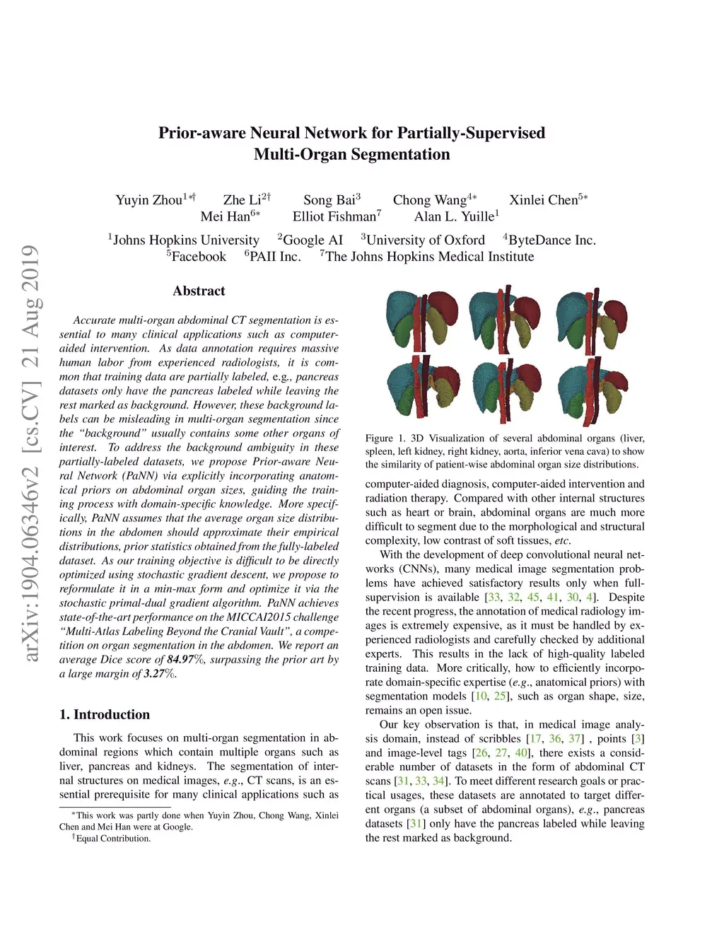 Accurate multi-organ abdominal CT segmentation is essential to many clinical applications such as computer-aided intervention. As data annotation requires massive human labor from experienced radiologists, it is common that training data are partially labeled, e.g., pancreas datasets only have the pancreas labeled while leaving the rest marked as background. However, these background labels can be misleading in multi-organ segmentation since the "background" usually contains some other organs of interest. To address the background ambiguity in these partially-labeled datasets, we propose Prior-aware Neural Network (PaNN) via explicitly incorporating anatomical priors on abdominal organ sizes, guiding the training process with domain-specific knowledge. More specifically, PaNN assumes that the average organ size distributions in the abdomen should approximate their empirical distributions, a prior statistics obtained from the fully-labeled dataset. As our training objective is difficult to be directly optimized using stochastic gradient descent [20], we propose to reformulate it in a min-max form and optimize it via the stochastic primal-dual gradient algorithm. PaNN achieves state-of-the-art performance on the MICCAI2015 challenge "Multi-Atlas Labeling Beyond the Cranial Vault", a competition on organ segmentation in the abdomen. We report an average Dice score of 84.97%, surpassing the prior art by a large margin of 3.27%.