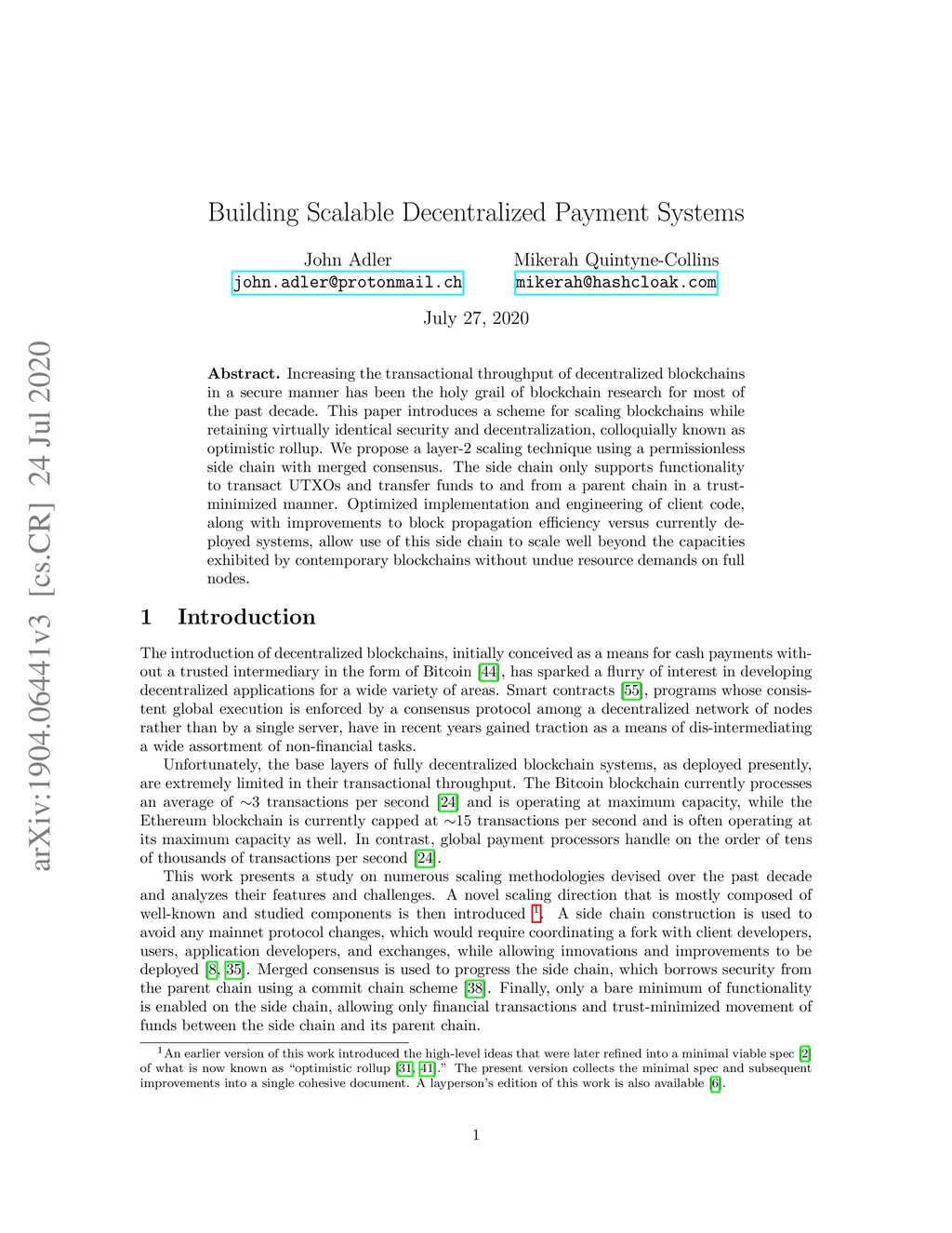 Increasing the transactional throughput of decentralized blockchains in a secure manner has been the holy grail of blockchain research for most of the past decade. This paper introduces a scheme for scaling blockchains while retaining virtually identical security and decentralization, colloquially known as optimistic rollup. We propose a layer-2 scaling technique using a permissionless side chain with merged consensus. The side chain only supports functionality to transact UTXOs and transfer funds to and from a parent chain in a trust-minimized manner. Optimized implementation and engineering of client code, along with improvements to block propagation efficiency versus currently deployed systems, allow use of this side chain to scale well beyond the capacities exhibited by contemporary blockchains without undue resource demands on full nodes.