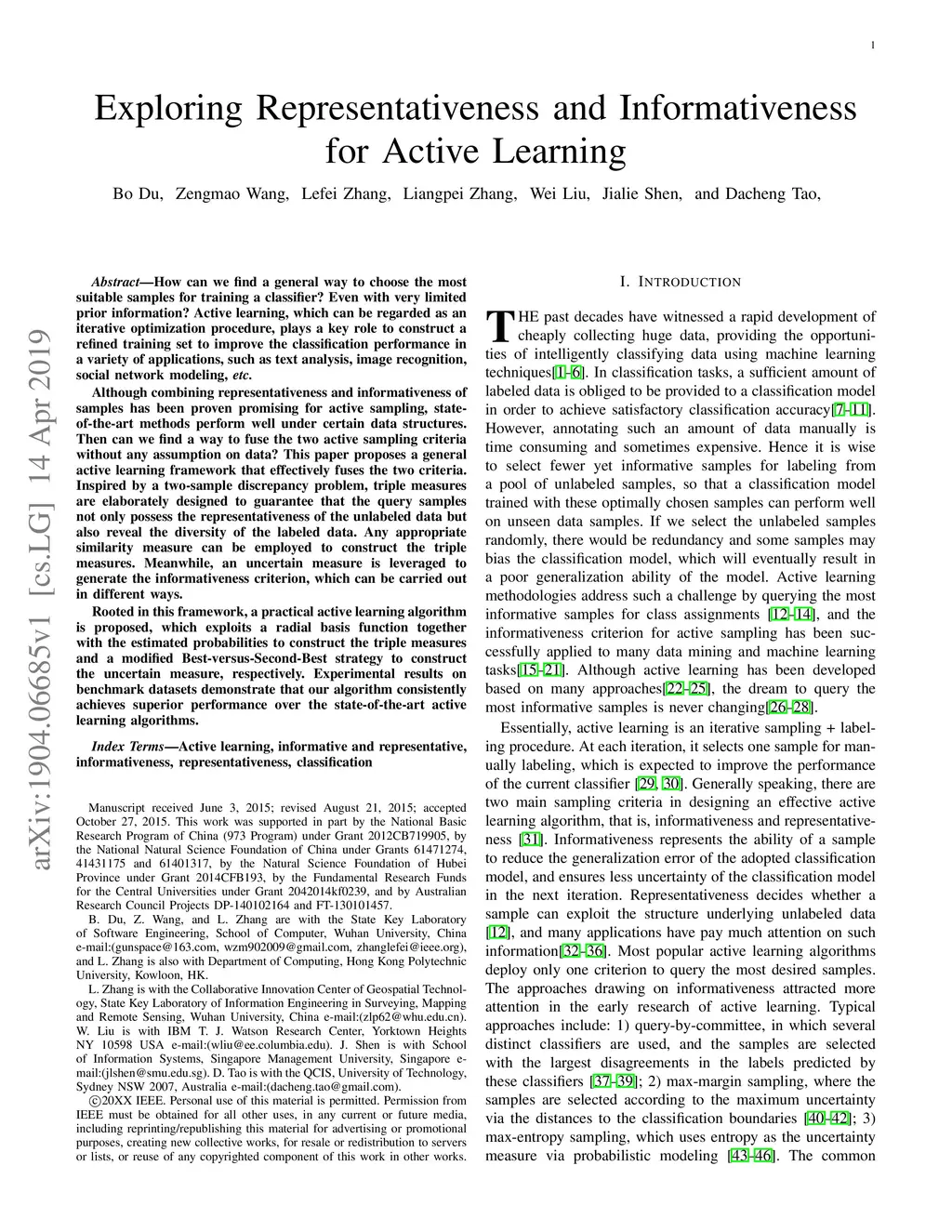 How can we find a general way to choose the most suitable samples for training a classifier? Even with very limited prior information? Active learning, which can be regarded as an iterative optimization procedure, plays a key role to construct a refined training set to improve the classification performance in a variety of applications, such as text analysis, image recognition, social network modeling, etc. Although combining representativeness and informativeness of samples has been proven promising for active sampling, state-of-the-art methods perform well under certain data structures. Then can we find a way to fuse the two active sampling criteria without any assumption on data? This paper proposes a general active learning framework that effectively fuses the two criteria. Inspired by a two-sample discrepancy problem, triple measures are elaborately designed to guarantee that the query samples not only possess the representativeness of the unlabeled data but also reveal the diversity of the labeled data. Any appropriate similarity measure can be employed to construct the triple measures. Meanwhile, an uncertain measure is leveraged to generate the informativeness criterion, which can be carried out in different ways. Rooted in this framework, a practical active learning algorithm is proposed, which exploits a radial basis function together with the estimated probabilities to construct the triple measures and a modified Best-versus-Second-Best strategy to construct the uncertain measure, respectively. Experimental results on benchmark datasets demonstrate that our algorithm consistently achieves superior performance over the state-of-the-art active learning algorithms.