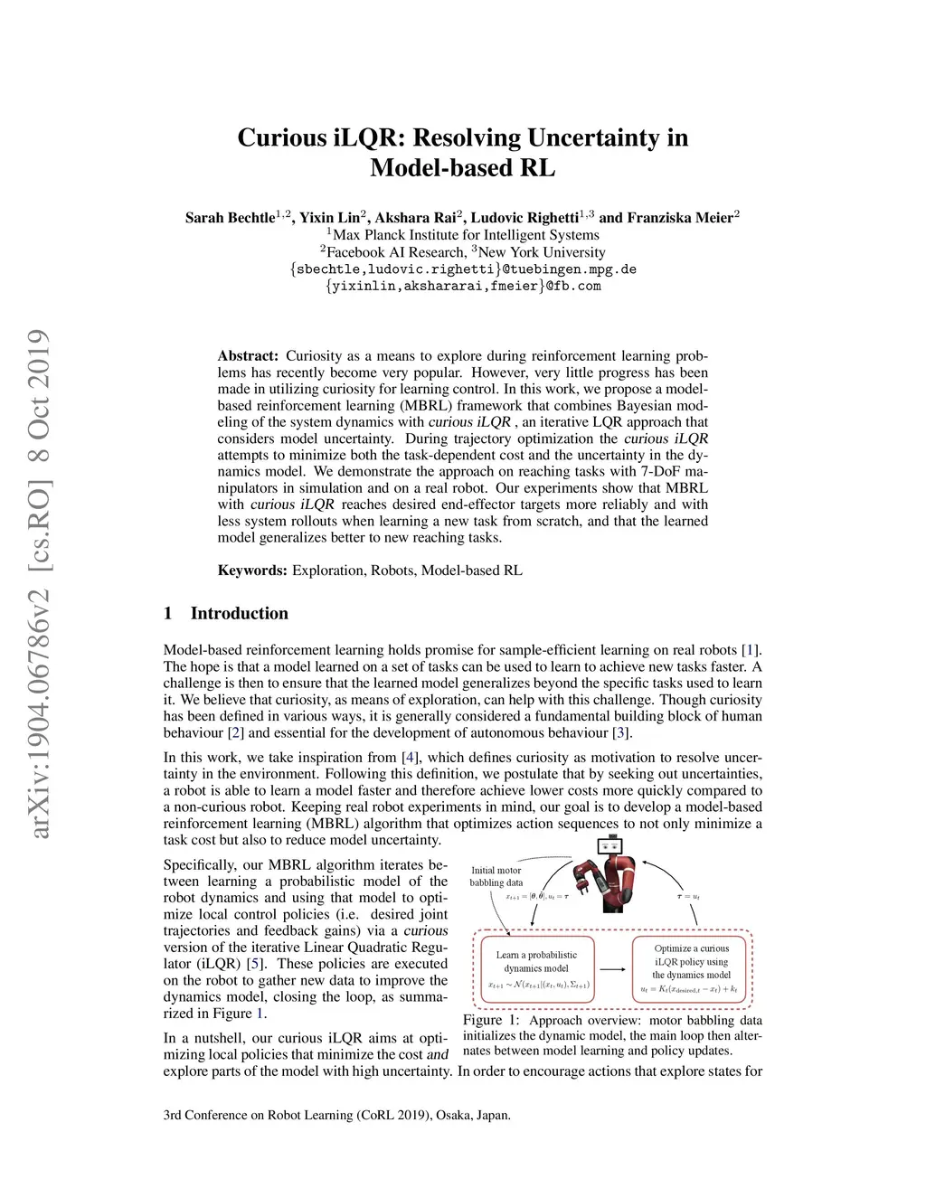 Curiosity as a means to explore during reinforcement learning problems has recently become very popular. However, very little progress has been made in utilizing curiosity for learning control. In this work, we propose a model-based reinforcement learning (MBRL) framework that combines Bayesian modeling of the system dynamics with curious iLQR, an iterative LQR approach that considers model uncertainty. During trajectory optimization the curious iLQR attempts to minimize both the task-dependent cost and the uncertainty in the dynamics model. We demonstrate the approach on reaching tasks with 7-DoF manipulators in simulation and on a real robot. Our experiments show that MBRL with curious iLQR reaches desired end-effector targets more reliably and with less system rollouts when learning a new task from scratch, and that the learned model generalizes better to new reaching tasks.