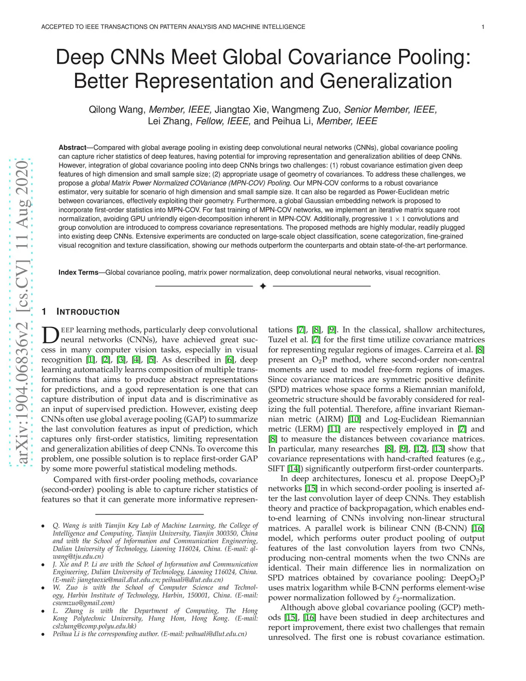 Compared with global average pooling in existing deep convolutional neural networks (CNNs), global covariance pooling can capture richer statistics of deep features, having potential for improving representation and generalization abilities of deep CNNs. However, integration of global covariance pooling into deep CNNs brings two challenges: (1) robust covariance estimation given deep features of high dimension and small sample size; (2) appropriate usage of geometry of covariances. To address these challenges, we propose a global Matrix Power Normalized COVariance (MPN-COV) Pooling. Our MPN-COV conforms to a robust covariance estimator, very suitable for scenario of high dimension and small sample size. It can also be regarded as Power-Euclidean metric between covariances, effectively exploiting their geometry. Furthermore, a global Gaussian embedding network is proposed to incorporate first-order statistics into MPN-COV. For fast training of MPN-COV networks, we implement an iterative matrix square root normalization, avoiding GPU unfriendly eigen-decomposition inherent in MPN-COV. Additionally, progressive 1x1 convolutions and group convolution are introduced to compress covariance representations. The proposed methods are highly modular, readily plugged into existing deep CNNs. Extensive experiments are conducted on large-scale object classification, scene categorization, fine-grained visual recognition and texture classification, showing our methods outperform the counterparts and obtain state-of-the-art performance.