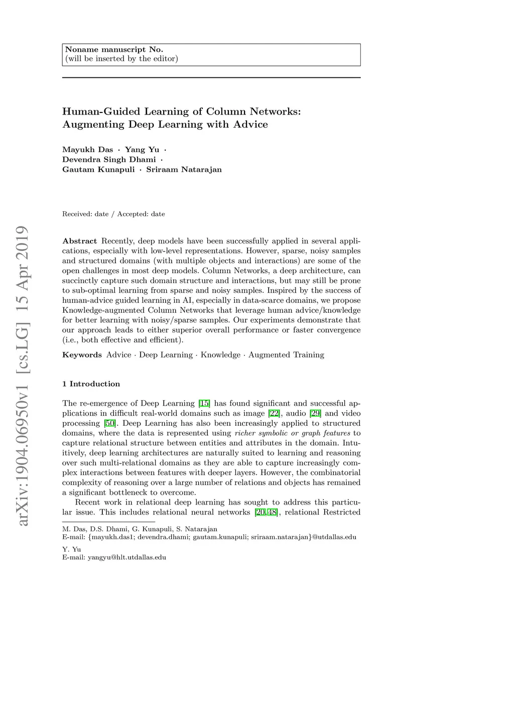 Recently, deep models have been successfully applied in several applications, especially with low-level representations. However, sparse, noisy samples and structured domains (with multiple objects and interactions) are some of the open challenges in most deep models. Column Networks, a deep architecture, can succinctly capture such domain structure and interactions, but may still be prone to sub-optimal learning from sparse and noisy samples. Inspired by the success of human-advice guided learning in AI, especially in data-scarce domains, we propose Knowledge-augmented Column Networks that leverage human advice/knowledge for better learning with noisy/sparse samples. Our experiments demonstrate that our approach leads to either superior overall performance or faster convergence (i.e., both effective and efficient).