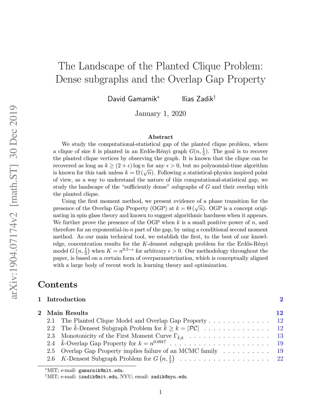 In this paper we study the computational-statistical gap of the planted clique problem, where a clique of size is planted in an Erdos Renyi graph resulting in a graph . The goal is to recover the planted clique vertices by observing . It is known that the clique can be recovered as long as $k \geq \left(2+\epsilon\right)\log n $ for any , but no polynomial-time algorithm is known for this task unless . Following a statistical-physics inspired point of view as an attempt to understand this computational-statistical gap, we study the landscape of the "sufficiently dense" subgraphs of and their overlap with the planted clique. Using the first moment method, we study the densest subgraph problems for subgraphs with fixed, but arbitrary, overlap size with the planted clique, and provide evidence of a phase transition for the presence of Overlap Gap Property (OGP) at . OGP is a concept introduced originally in spin glass theory and known to suggest algorithmic hardness when it appears. We establish the presence of OGP when is a small positive power of by using a conditional second moment method. As our main technical tool, we establish the first, to the best of our knowledge, concentration results for the -densest subgraph problem for the Erdos-Renyi model when for arbitrary . Finally, to study the OGP we employ a certain form of overparametrization, which is conceptually aligned with a large body of recent work in learning theory and optimization.