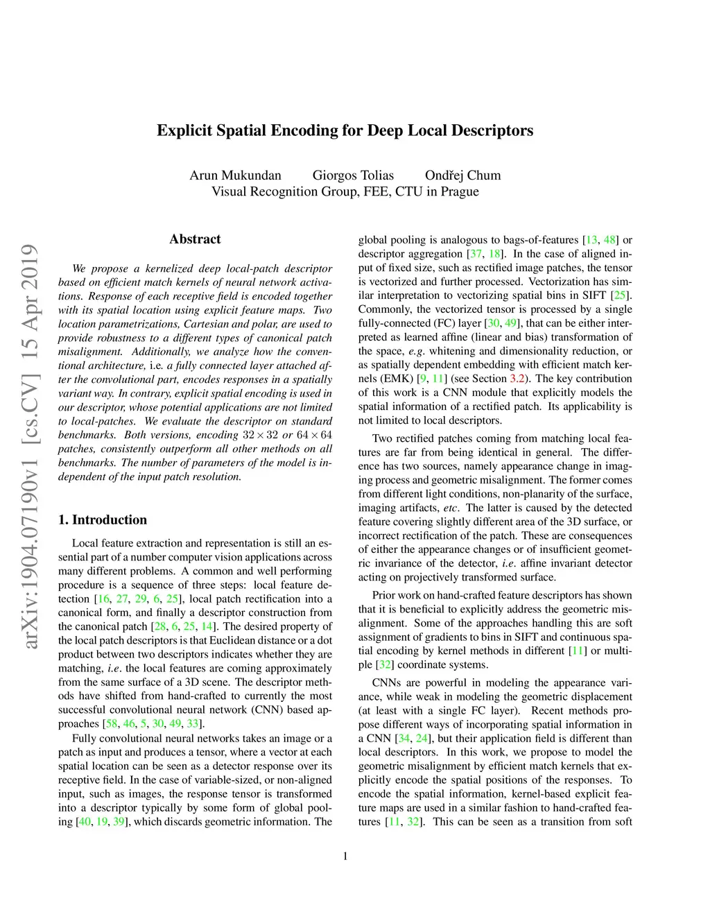 We propose a kernelized deep local-patch descriptor based on efficient match kernels of neural network activations. Response of each receptive field is encoded together with its spatial location using explicit feature maps. Two location parametrizations, Cartesian and polar, are used to provide robustness to a different types of canonical patch misalignment. Additionally, we analyze how the conventional architecture, i.e. a fully connected layer attached after the convolutional part, encodes responses in a spatially variant way. In contrary, explicit spatial encoding is used in our descriptor, whose potential applications are not limited to local-patches. We evaluate the descriptor on standard benchmarks. Both versions, encoding 32x32 or 64x64 patches, consistently outperform all other methods on all benchmarks. The number of parameters of the model is independent of the input patch resolution.