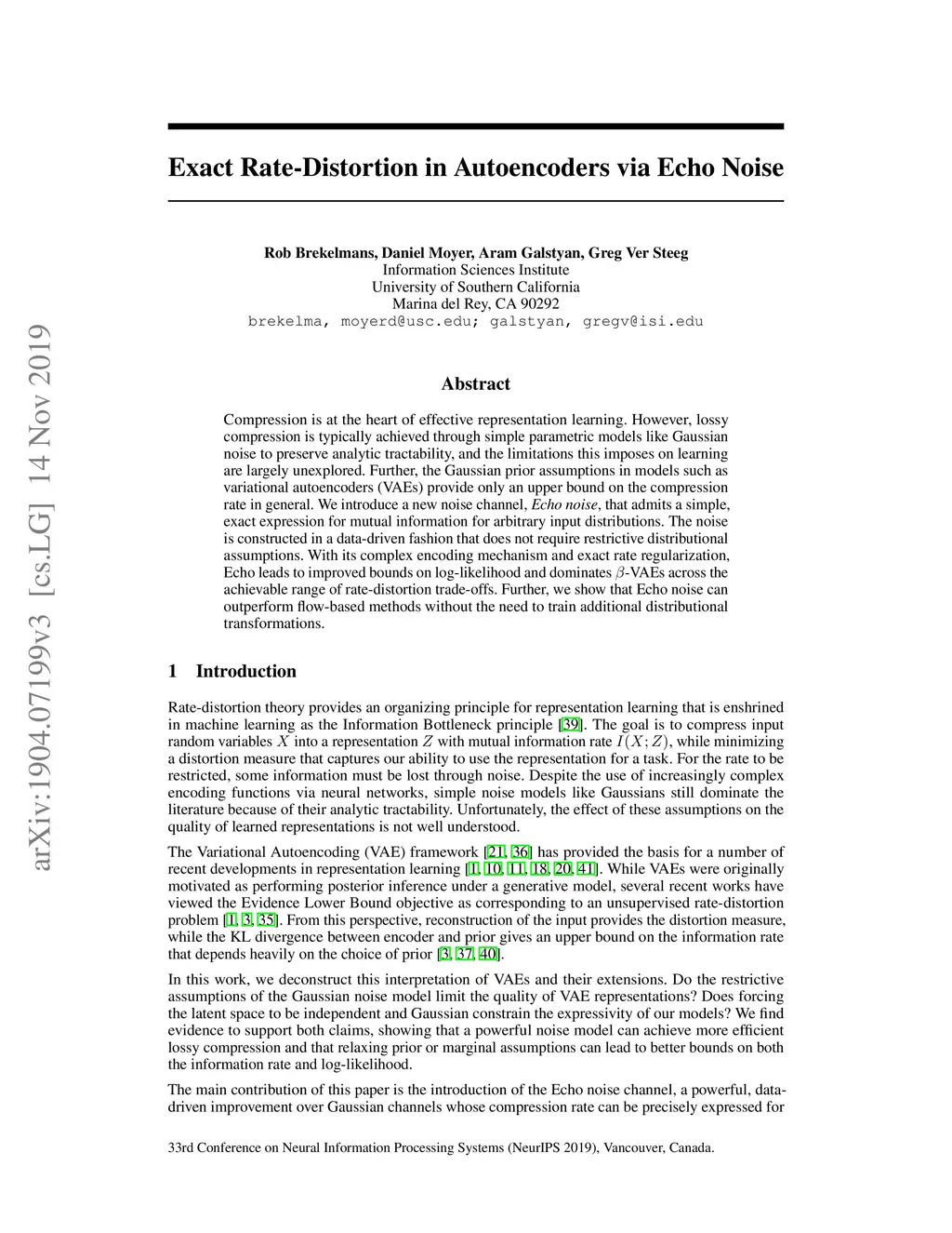 Compression is at the heart of effective representation learning. However, lossy compression is typically achieved through simple parametric models like Gaussian noise to preserve analytic tractability, and the limitations this imposes on learning are largely unexplored. Further, the Gaussian prior assumptions in models such as variational autoencoders (VAEs) provide only an upper bound on the compression rate in general. We introduce a new noise channel, \emph{Echo noise}, that admits a simple, exact expression for mutual information for arbitrary input distributions. The noise is constructed in a data-driven fashion that does not require restrictive distributional assumptions. With its complex encoding mechanism and exact rate regularization, Echo leads to improved bounds on log-likelihood and dominates -VAEs across the achievable range of rate-distortion trade-offs. Further, we show that Echo noise can outperform flow-based methods without the need to train additional distributional transformations.