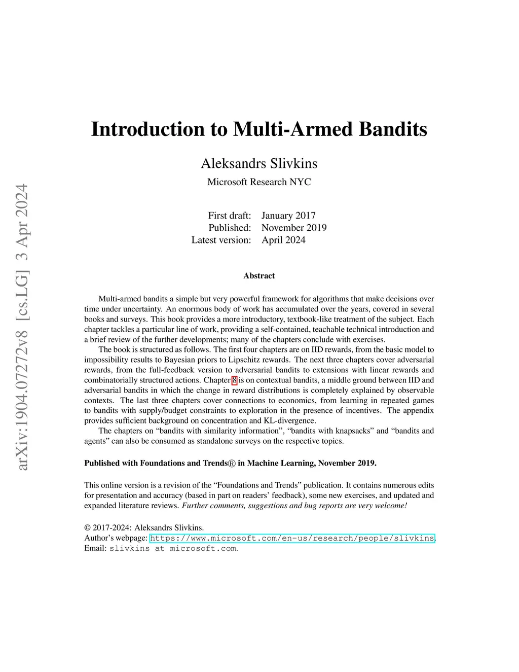 Multi-armed bandits a simple but very powerful framework for algorithms that make decisions over time under uncertainty. An enormous body of work has accumulated over the years, covered in several books and surveys. This book provides a more introductory, textbook-like treatment of the subject. Each chapter tackles a particular line of work, providing a self-contained, teachable technical introduction and a brief review of the further developments; many of the chapters conclude with exercises. The book is structured as follows. The first four chapters are on IID rewards, from the basic model to impossibility results to Bayesian priors to Lipschitz rewards. The next three chapters cover adversarial rewards, from the full-feedback version to adversarial bandits to extensions with linear rewards and combinatorially structured actions. Chapter 8 is on contextual bandits, a middle ground between IID and adversarial bandits in which the change in reward distributions is completely explained by observable contexts. The last three chapters cover connections to economics, from learning in repeated games to bandits with supply/budget constraints to exploration in the presence of incentives. The appendix provides sufficient background on concentration and KL-divergence. The chapters on "bandits with similarity information", "bandits with knapsacks" and "bandits and agents" can also be consumed as standalone surveys on the respective topics.