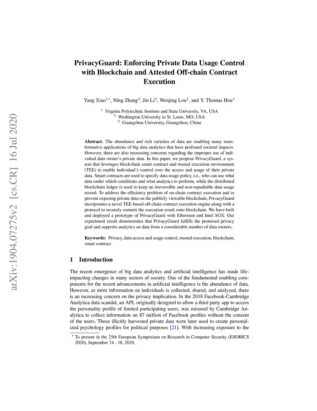 The abundance of rich varieties of data is enabling many transformative applications of big data analytics that have profound societal impacts. However, there are also increasing concerns regarding the improper use of individual users' private data. Many argue that the technology that customizes our experience in the cyber domain is threatening the fundamental civil right to privacy. In this paper, we propose PrivacyGuard, a system that leverages smart contract in blockchain and trusted execution environment to enable individuals' control over other parties' access and use of their private data. In our design, smart contracts are used to specify data usage policy (i.e. who can use what data under which conditions along with how the data can be used), while the distributed ledger is used to keep an irreversible and non-repudiable record of data usage. To address the contract execution efficiency problem, as well as to prevent exposing user data on the publicly viewable blockchain, we construct a novel off-chain contract execution engine which realizes trustworthy contract execution off-chain in an trusted execution environment (TEE). By running the contract program inside a hardware-assisted TEE, the proposed off-chain trustworthy contract execution improves system efficiency significantly, as its correctness does not rely on distributed consensus which essentially requires the contract program be executed on all miner nodes. In order to leverage TEE in off-chain execution, PrivacyGuard has to several technical challenges such as synchronous function completion and scalability mitigation in blockchain platform. We build and deploy a prototype of PrivacyGuard using Ethereum and Intel SGX, and our experiments demonstrate the feasibility to support data-intensive applications using data from a large number of users.