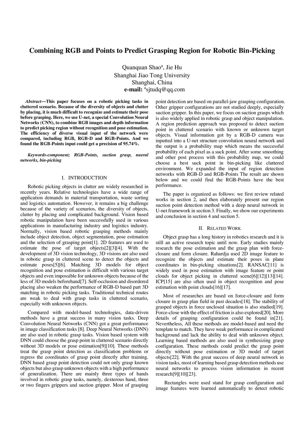 This paper focuses on a robotic picking tasks in cluttered scenario. Because of the diversity of objects and clutter by placing, it is much difficult to recognize and estimate their pose before grasping. Here, we use U-net, a special Convolution Neural Networks (CNN), to combine RGB images and depth information to predict picking region without recognition and pose estimation. The efficiency of diverse visual input of the network were compared, including RGB, RGB-D and RGB-Points. And we found the RGB-Points input could get a precision of 95.74%.