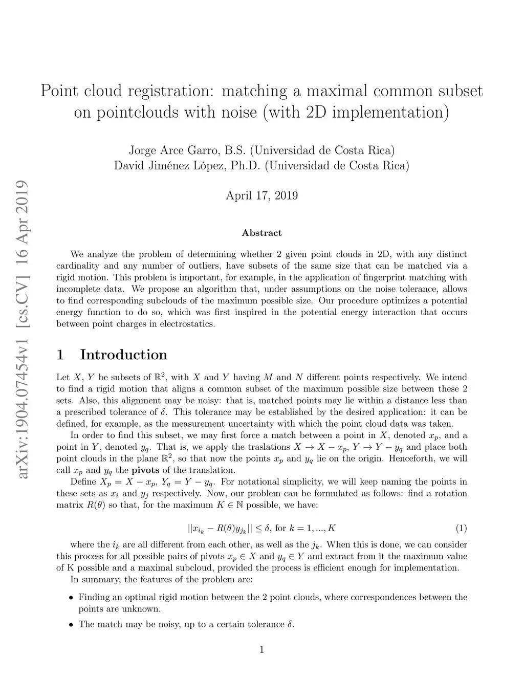 We analyze the problem of determining whether 2 given point clouds in 2D, with any distinct cardinality and any number of outliers, have subsets of the same size that can be matched via a rigid motion. This problem is important, for example, in the application of fingerprint matching with incomplete data. We propose an algorithm that, under assumptions on the noise tolerance, allows to find corresponding subclouds of the maximum possible size. Our procedure optimizes a potential energy function to do so, which was first inspired in the potential energy interaction that occurs between point charges in electrostatics.
