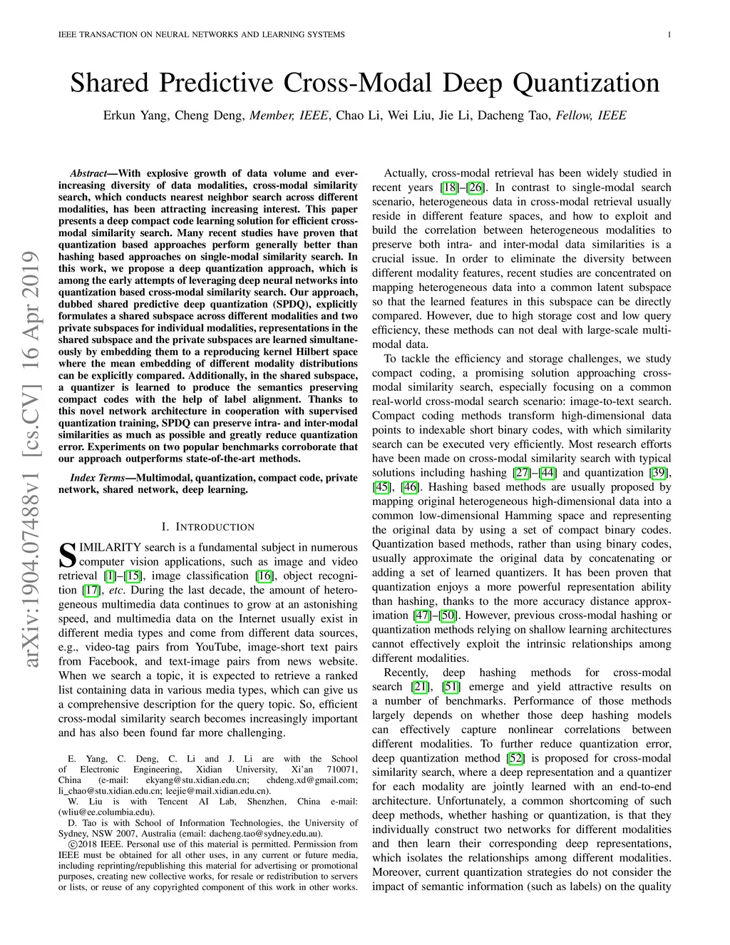 With explosive growth of data volume and ever-increasing diversity of data modalities, cross-modal similarity search, which conducts nearest neighbor search across different modalities, has been attracting increasing interest. This paper presents a deep compact code learning solution for efficient cross-modal similarity search. Many recent studies have proven that quantization-based approaches perform generally better than hashing-based approaches on single-modal similarity search. In this paper, we propose a deep quantization approach, which is among the early attempts of leveraging deep neural networks into quantization-based cross-modal similarity search. Our approach, dubbed shared predictive deep quantization (SPDQ), explicitly formulates a shared subspace across different modalities and two private subspaces for individual modalities, and representations in the shared subspace and the private subspaces are learned simultaneously by embedding them to a reproducing kernel Hilbert space, where the mean embedding of different modality distributions can be explicitly compared. In addition, in the shared subspace, a quantizer is learned to produce the semantics preserving compact codes with the help of label alignment. Thanks to this novel network architecture in cooperation with supervised quantization training, SPDQ can preserve intramodal and intermodal similarities as much as possible and greatly reduce quantization error. Experiments on two popular benchmarks corroborate that our approach outperforms state-of-the-art methods.