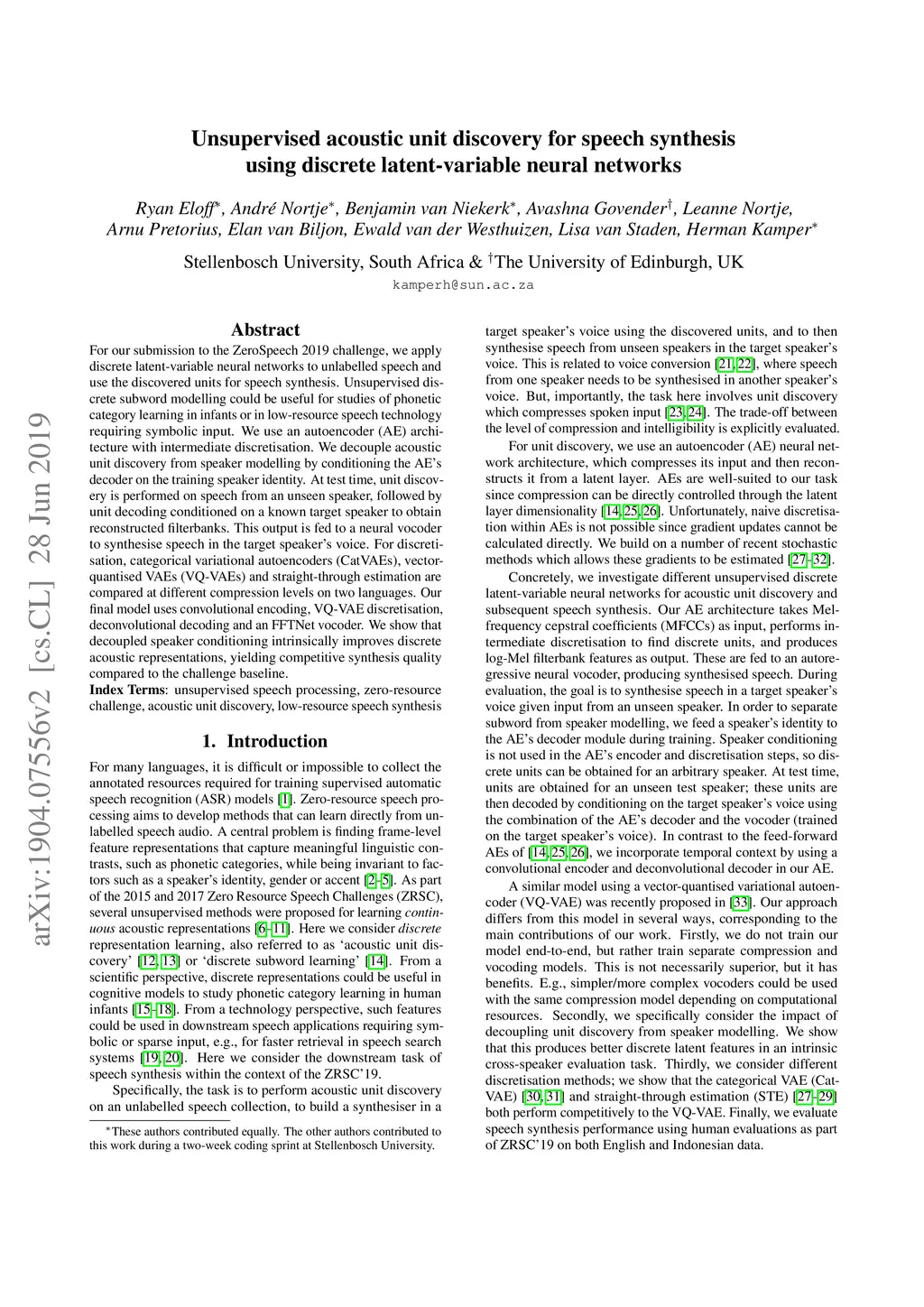 For our submission to the ZeroSpeech 2019 challenge, we apply discrete latent-variable neural networks to unlabelled speech and use the discovered units for speech synthesis. Unsupervised discrete subword modelling could be useful for studies of phonetic category learning in infants or in low-resource speech technology requiring symbolic input. We use an autoencoder (AE) architecture with intermediate discretisation. We decouple acoustic unit discovery from speaker modelling by conditioning the AE's decoder on the training speaker identity. At test time, unit discovery is performed on speech from an unseen speaker, followed by unit decoding conditioned on a known target speaker to obtain reconstructed filterbanks. This output is fed to a neural vocoder to synthesise speech in the target speaker's voice. For discretisation, categorical variational autoencoders (CatVAEs), vector-quantised VAEs (VQ-VAEs) and straight-through estimation are compared at different compression levels on two languages. Our final model uses convolutional encoding, VQ-VAE discretisation, deconvolutional decoding and an FFTNet vocoder. We show that decoupled speaker conditioning intrinsically improves discrete acoustic representations, yielding competitive synthesis quality compared to the challenge baseline.