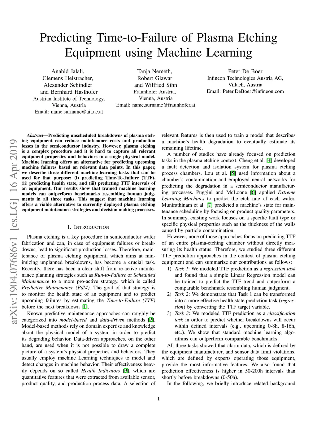 Predicting Time-to-Failure of Plasma Etching Equipment using Machine